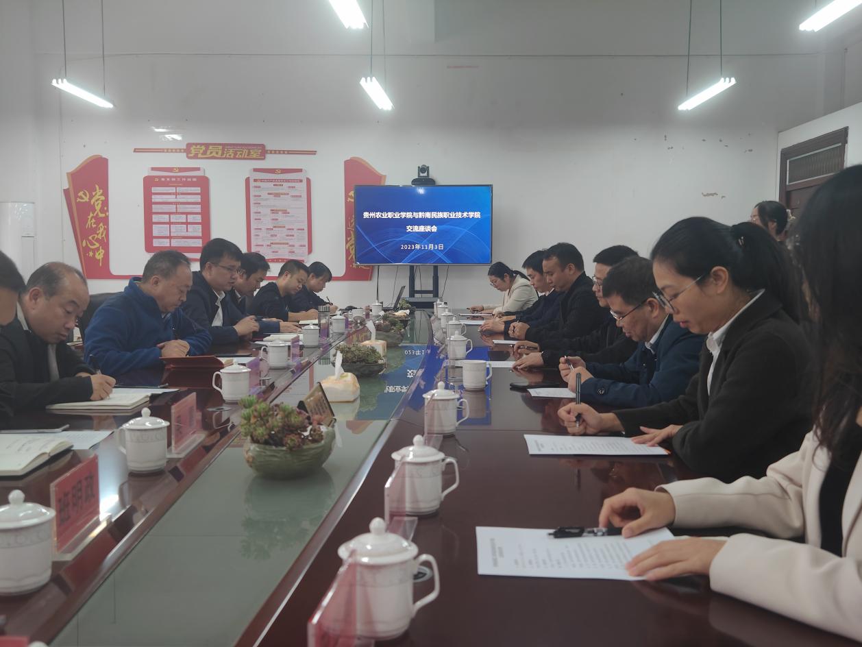 11月3日,学院赴全国乡村振兴人才培养优质校、贵州农业职业教育集团理事长单位——贵州农业职业学院进行调研和交流。贵州农业职业学院党委委员、副院长韩昌权,省畜牧兽医学校副校长许芳等与我院教务处处长杨均、现代山地农业工程系党总支书记朱永毅、系主任徐本刚一行开展交流座谈。