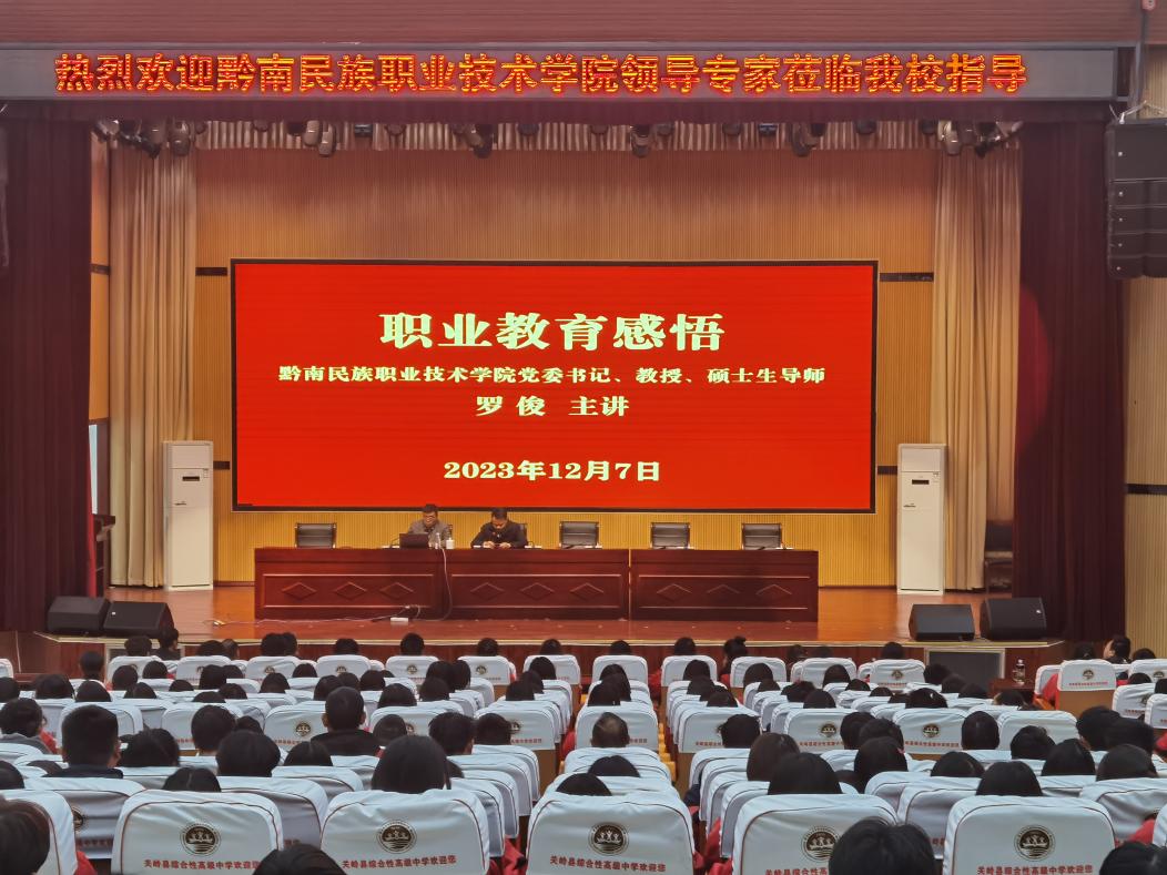 在关岭县综合性高中,罗俊同志面向有关校领导、“3+3”中高职贯通班班主任和学生作了题为“职业教育感悟”的专题报告。罗俊强调:没有爱心的教育不是教育。有爱才为教育,用自己的爱心浇灌学生的成长。用语言播种,用彩笔耕耘,用汗水浇灌,用心血滋润。爱生如己,教生如子,待生如友。