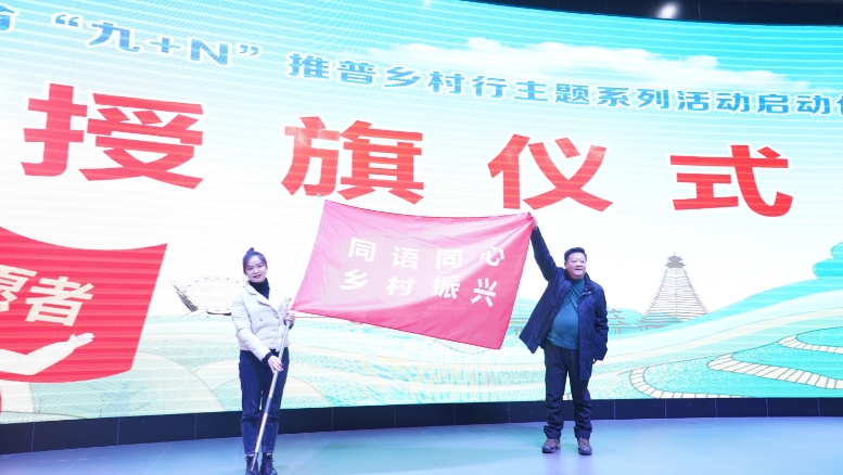 随后,赵廷昌给石丽菊授同语同心·乡村振兴旗帜,张世平给贵州广播电视台节目主持人欧杰授推普志愿者旗帜。