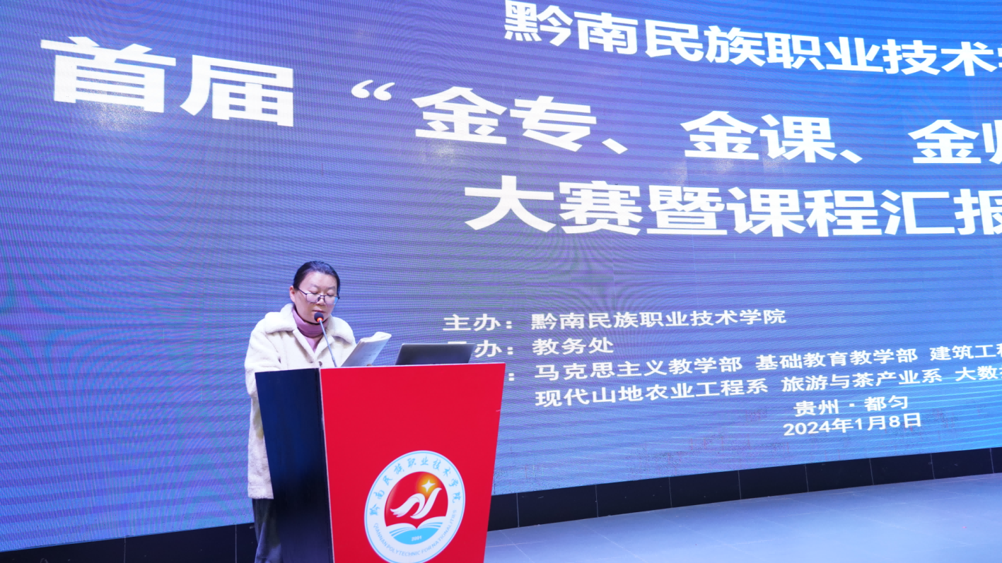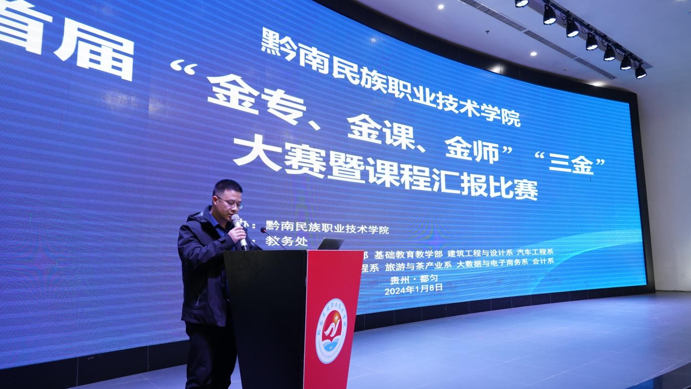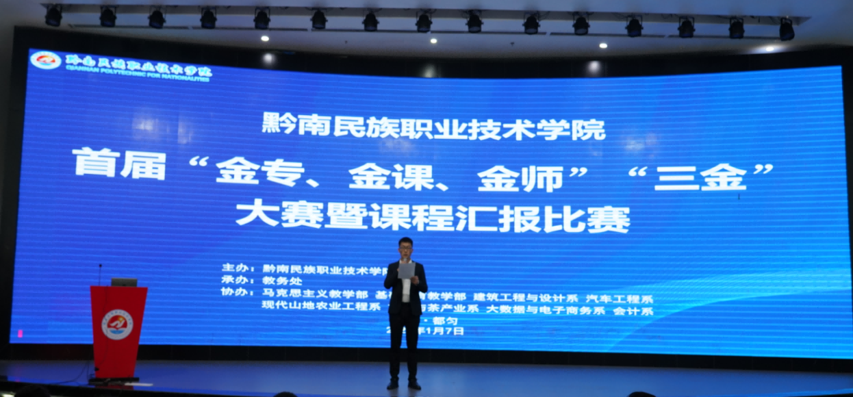 课程汇报是教师钻研教材、探讨教法、不断提高教学水平的有效方法,更是促进教师专业化发展的有效途径。为加强我院师资队伍建设,鼓励教师积极参与教学研究,促进教师的快速成长,培养教师把握教材和处理教材的能力,提高课堂教学水平,达到以“说”促“教”的目的,我院近日,在学术报告厅以课程汇报形式成功举办了黔南民族职业技术学院首届“金专、金课、金师”“三金”大赛暨课程汇报比赛。学院高度重视,党委书记罗俊、院长刘荣鹏、副院长何琳亲临现场指导。各系主要负责人、全体任课教师到场观摩和学习。
