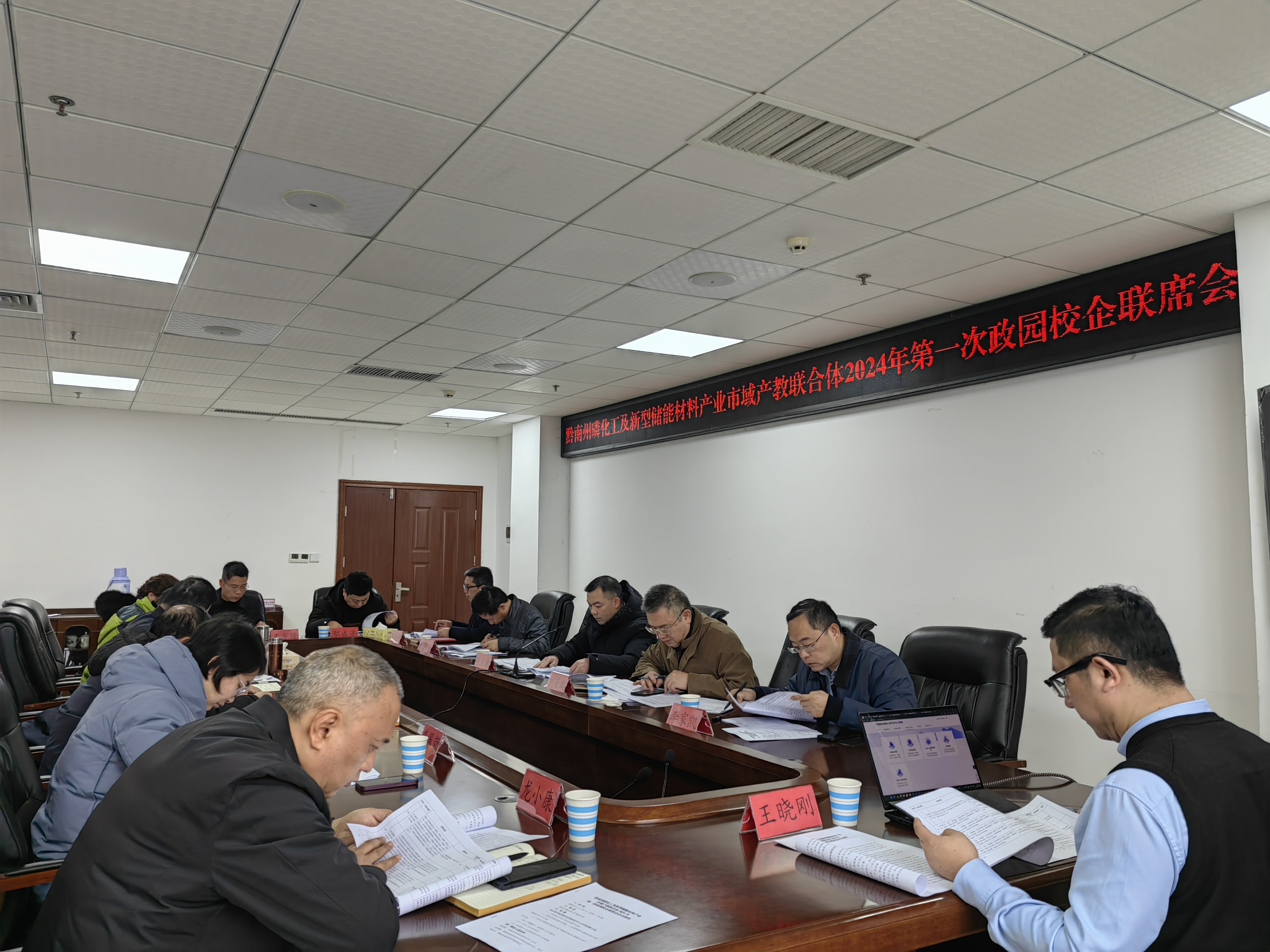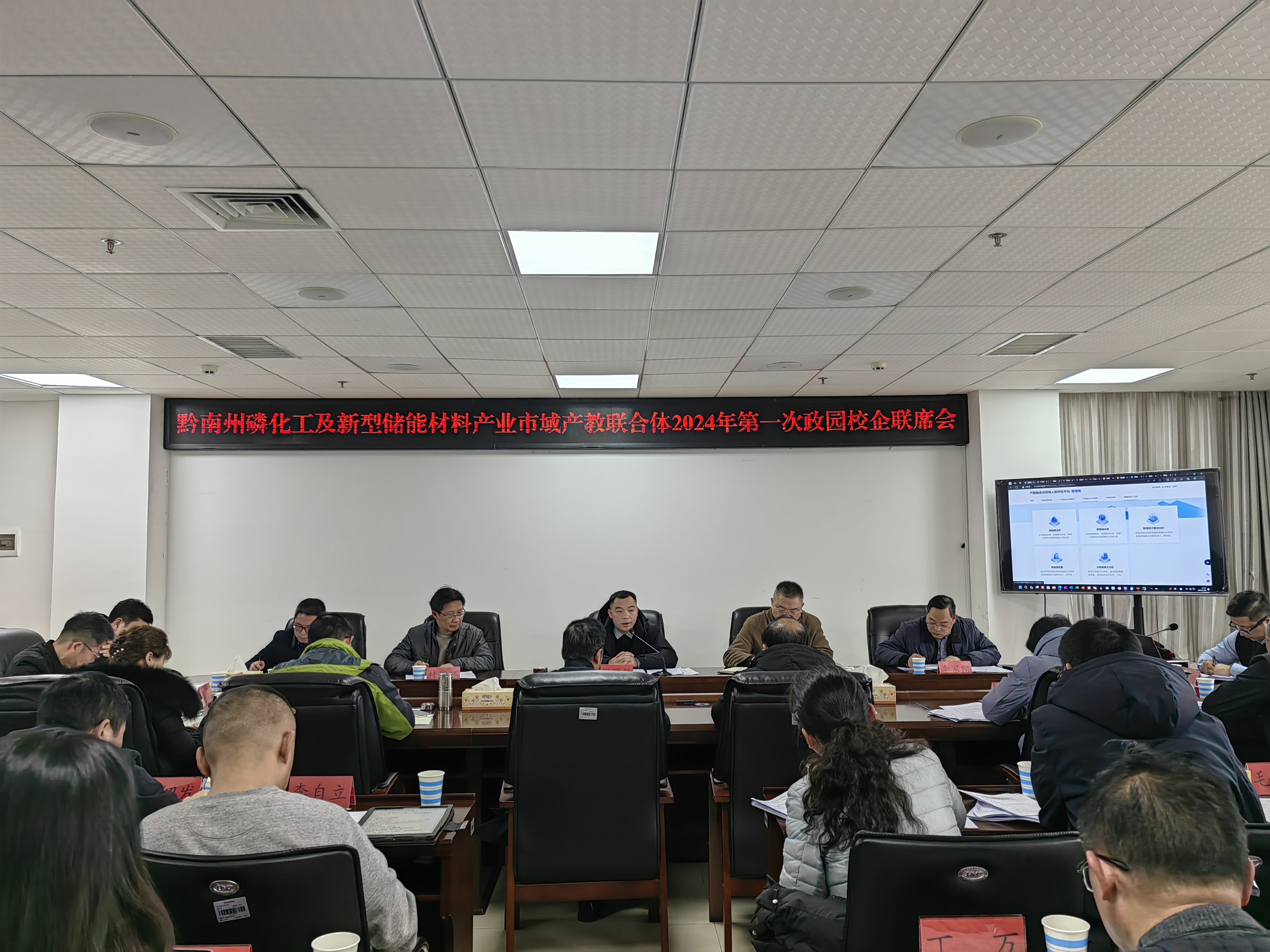 2024年1月29日,黔南州磷化工及新型储能材料产业市域产教联合体2024年第一次政园校企联席会在黔南州教育局会议室召开。黔南州政府经济发展研究中心主任、联合体理事长张国乾,黔南州教育局党委委员、正县级督学陈清涛,学院院长刘荣鹏出席会议。会议由黔南州政府经济发展研究中心主任、联合体理事长张国乾主持。