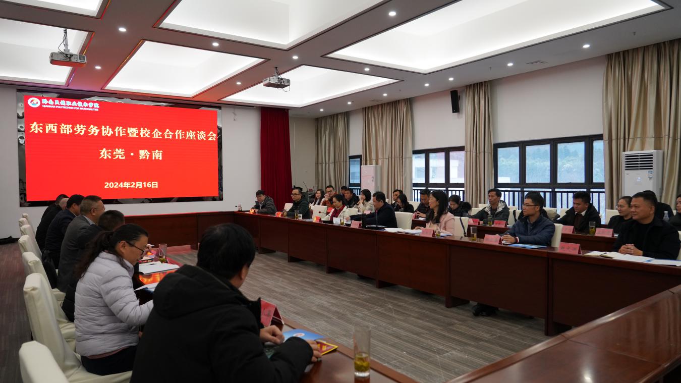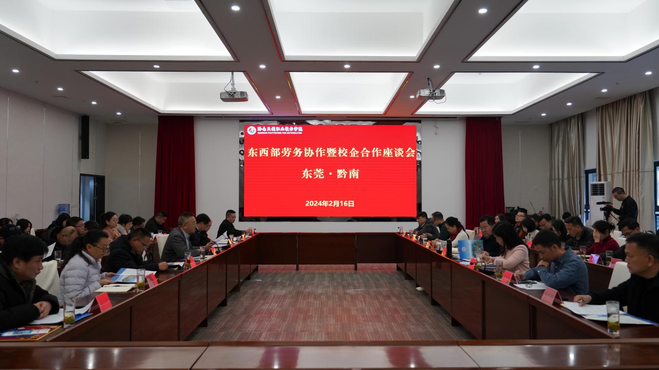 为进一步深化东莞和黔南劳务协作,奠定校企合作基础,2024年2月16日,东莞·黔南东西部劳务协作暨校企合作座谈会在黔南民族职业技术学院召开。东莞市人力资源和社会保障局局长陈智武,黔南州人力资源和社会保障局局长张军、副局长文斯奇,黔南民族职业技术学院院长刘荣鹏出席。东莞市和黔南州人社部门相关负责同志,黔南民族师范学院、黔南民族职业技术学院、黔南民族医学高等专科学校相关负责同志,东莞市相关企业负责人,黔南民族职业技术学院2024届毕业生代表参加会议。会议由张军局长主持。