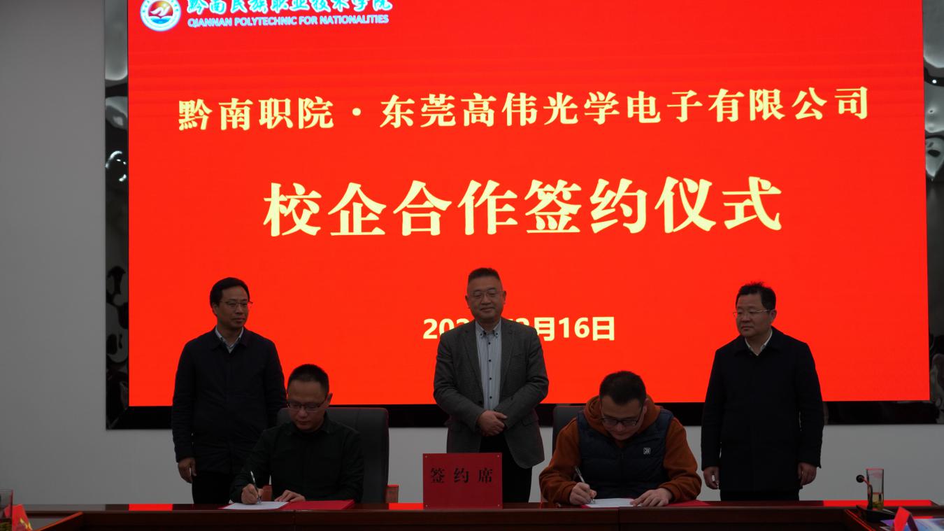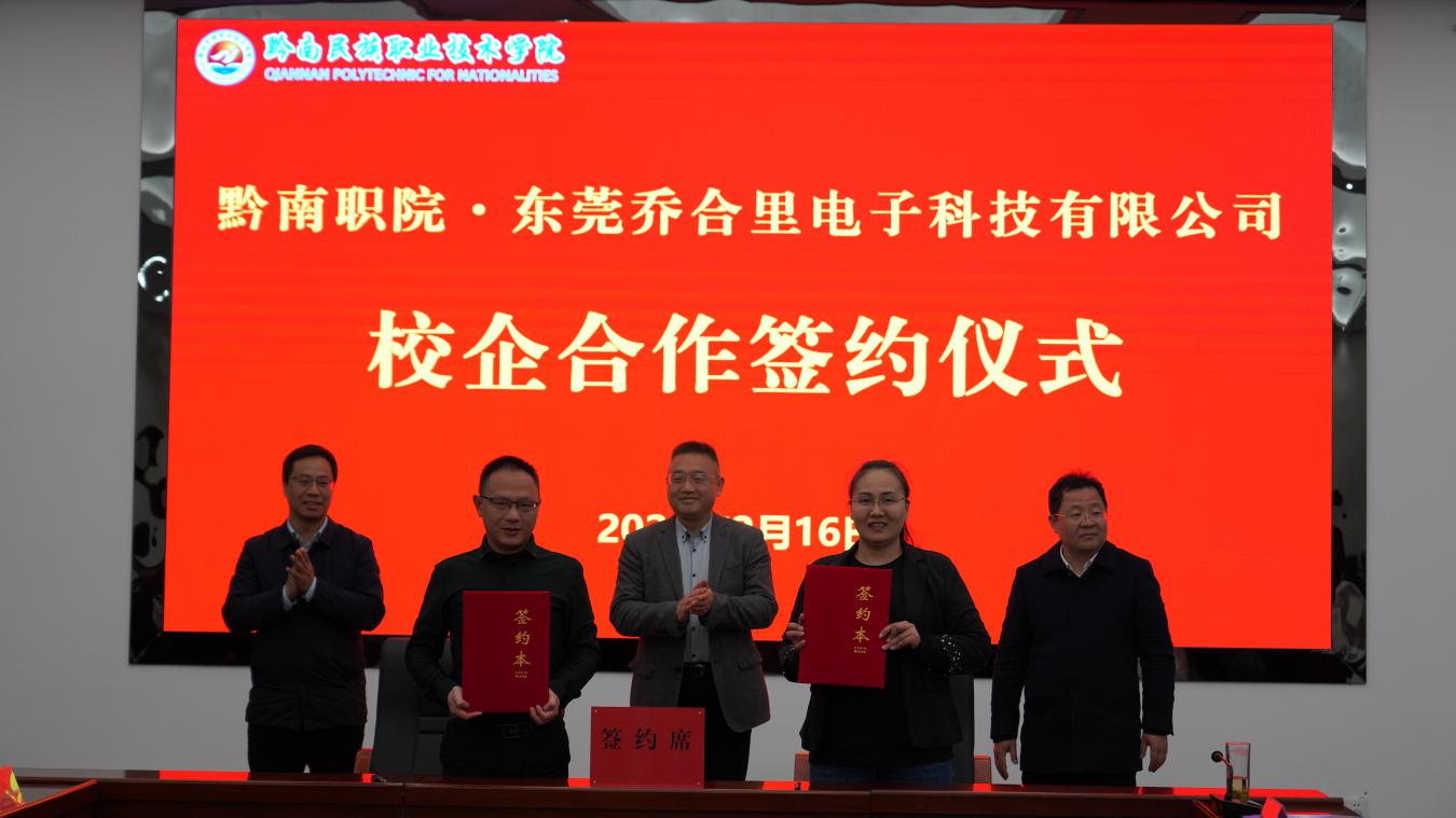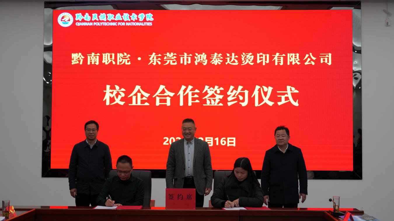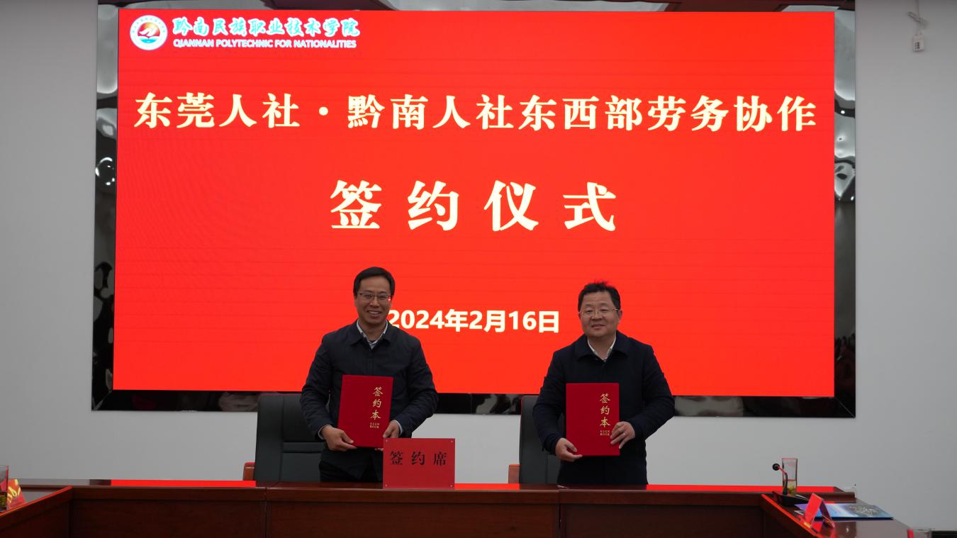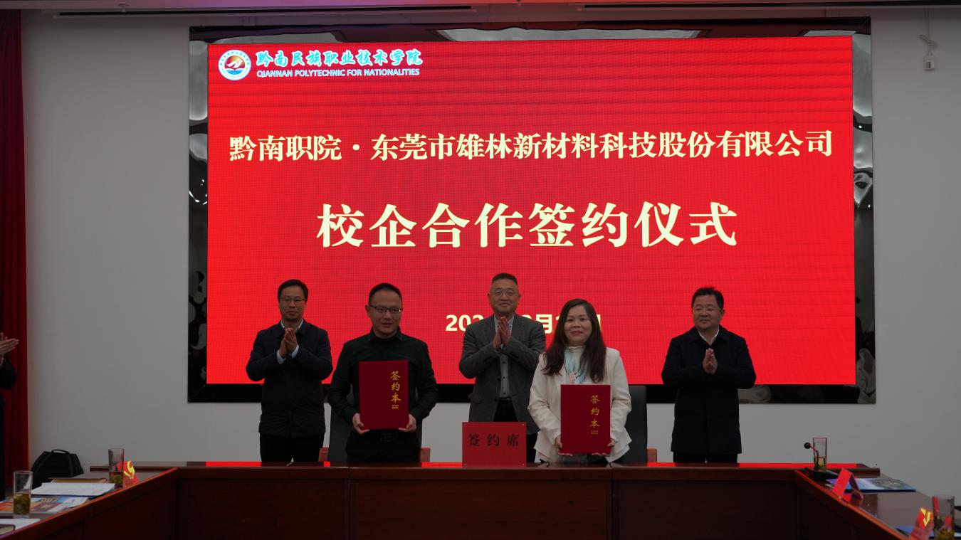 最后,在双方参会人员的见证下,东莞市人社局与黔南州人社局签订了劳务协作协议,东莞市乔合里电子科技有限公司、高伟光学电子有限公司、鸿泰达烫印有限公司、雄林新材料科技股份有限公司4家企业与黔南民族职业技术学院签订了校企合作协议。