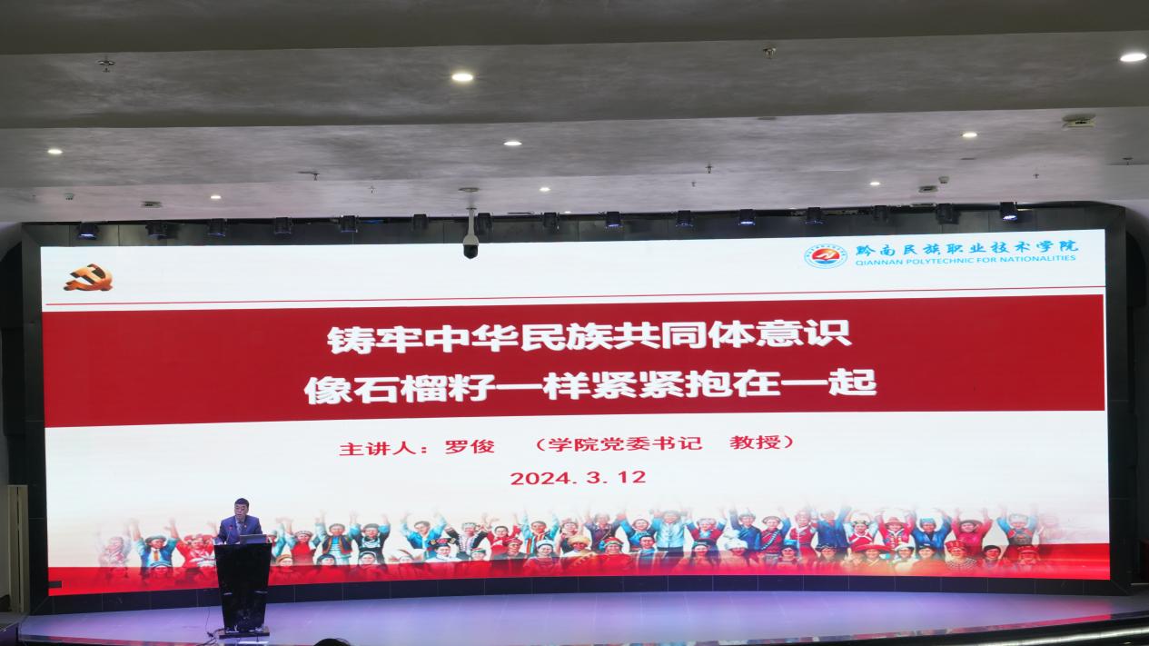 3月12日,学院党委书记罗俊以《铸牢中华民族共同体意识 像石榴籽一样紧紧抱在一起》为题,从“铸牢中华民族共同体意识的战略意义(为什么)”、“把握铸牢中华民族共同体意识的丰富内涵 (是什么)”和“铸牢中华民族共同体意识的实践路径 (如何做)”三方面,为全体思政课教师、辅导员代表、及师生代表上了一堂厚植青年学生爱党、爱国、爱社会主义、爱人民、爱集体的真挚情感的“开学第一课”。
