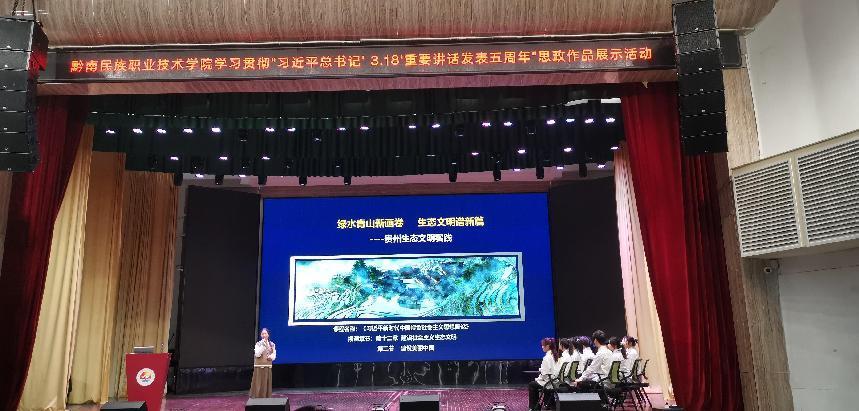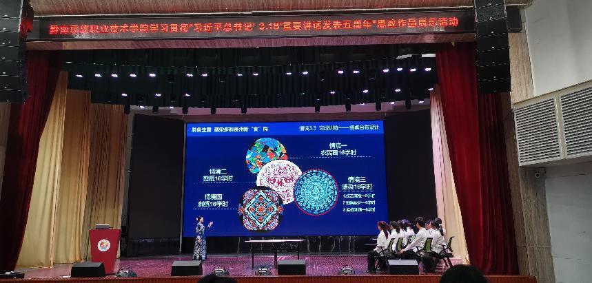 思政课教师张俞展示荣获2023年贵州省高校思想政治理论课教学活动二等奖作品《新时代我国社会的主要矛盾》,建筑系专业课教师金诚颖展示荣获全国旅游职业院校“学习二十大 铸魂育新人”课程思政优秀案例作品《黔色生香 蕴染多彩贵州新“食”尚餐桌台布设计》,刘杰、罗皓、邵泽雨、彭梦杰等四位同学展示荣获第七届全国高校大学生讲思政课公开课展示活动一等奖作品《绿水青山新画卷 生态文明谱新篇——贵州生态文明的生动实践》。