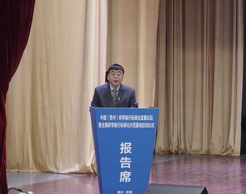 党委书记罗俊发表了热情洋溢的致辞。他首先对所有到场的嘉宾表示热烈欢迎,并对长期以来支持学院发展的各界人士表示感谢。也详细介绍了黔南职院的发展历程、教育特色和研学旅行的成就,并阐述了学院在推动研学旅行标准化方面的努力和贡献。