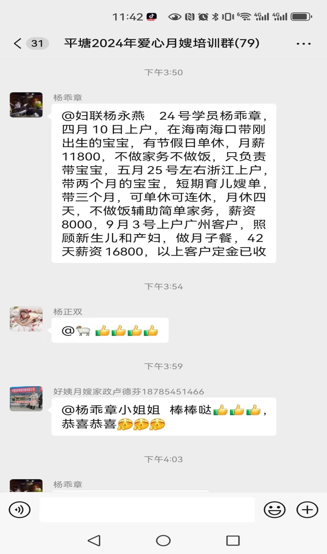 近日,平塘县妇联主席杨永燕收到了一条信息,内容为“24号学员杨乖章,4月10日上户,在海南海口带刚出生的宝宝,有节假日单休,月薪11800元。5月25日左右浙江上户,3个月短期育儿嫂单,薪资8000元/月;9月3日上户广州,42天薪资16800元,以上客户定金已收”这是平塘“爱心月嫂”培训结束后,陆续收到的学员就业信息之一。