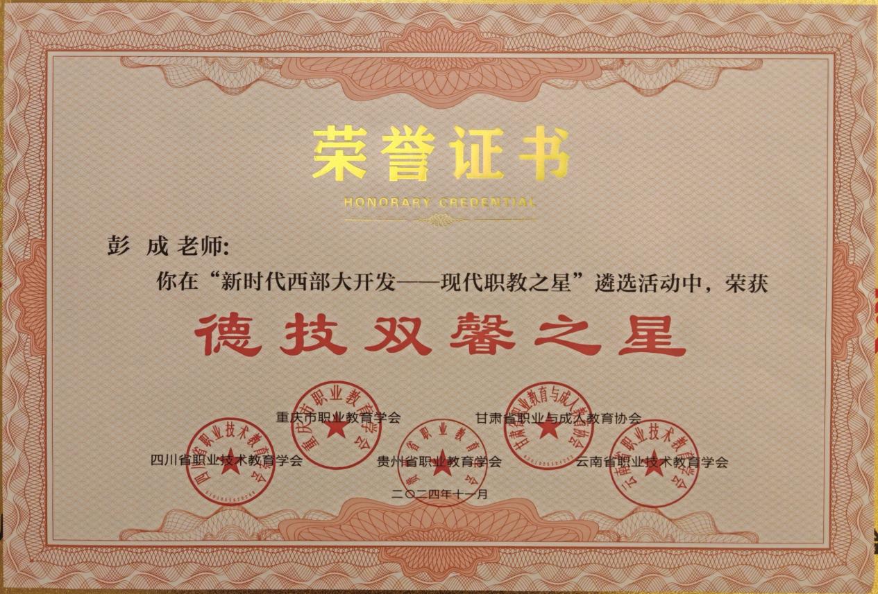 近日,由渝职教学会组织、渝甘川贵云五省市联合开展的“新时代西部大开发—现代职教之星”遴选活动结果公布,其中,学院获“创新发展之星职业院校”,推荐的贵州吉利汽车制造有限公司获“产教融合之星企业”,彭成老师获“德技双馨之星”,唐永娇、彭梦杰、杨秀花、黄耘耘4位学生获“技术技能之星”。