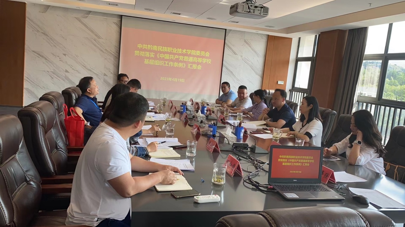 为扎实推进《中国共产党普通高等学校基层组织工作条例》,州委调研组一行到我院调研《条例》工作落实情况,4月19日,贯彻落实《条例》调研工作会在知行楼六楼一会议室举行。学院党委副书记韦永革、宣传部长高扬、党建办负责人姜克安及各系部党建负责人参加会议,会议由高扬主持。