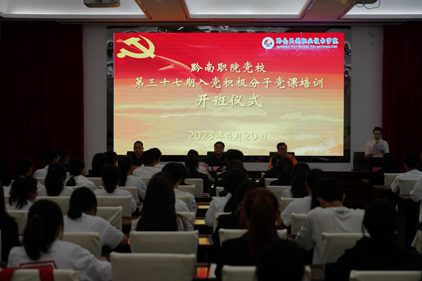 4月20日下午,黔南职院第37期入党积极分子培训班开班仪式在学院知行楼道德讲堂如期举行,学院党委副书记韦永革、党建办负责人姜克安出席开班仪式,党建办陈洪升、黄南莉及相关人员参加,开班仪式由培训班班主任黄南莉主持。
