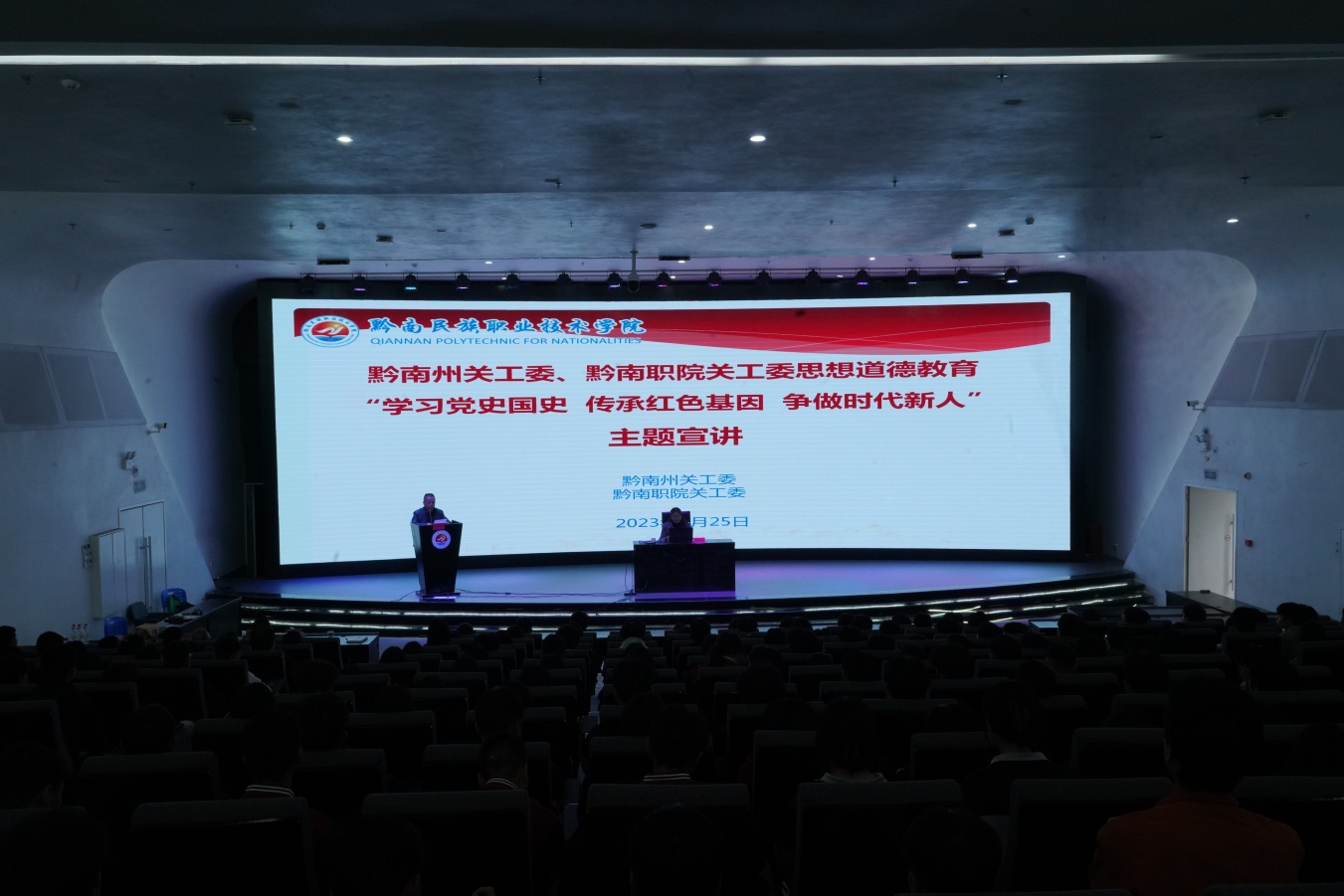 为深入学习贯彻党的二十大精神,让广大青少年了解红色文化、坚定理想信念,用实际行动把红色基因一代代传承下去。4月25日下午,州关工委思想道德教育“学习党史国史 传承红色基因 争做时代新人”主题教育活动系列讲座第四期主题宣讲会在学院知行楼思齐厅举行。宣讲会由学院机关总支书记史黔匀主持,州关工委思想道德教育特聘专家、州委党史学习教育优秀宣讲员、州图书馆原馆长、研究馆员陈剑虹主讲。州关工委常务副主任丁匀出席并指导。学院党委领导、师生代表300余人到场聆听讲座。