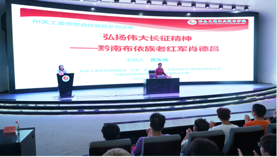 本次宣讲会特邀主讲人为州关工委思想道德教育“五老”宣讲团成员、州委党史学习教育优秀宣讲员、州委统战部原科长、老红军肖德昌大儿媳贾天成。宣讲会由组织部副部长孔育生主持。州关工委常务副主任丁匀和州关工委办公室刘红出席并指导。学院党委领导、师生代表300余人到场聆听讲座。