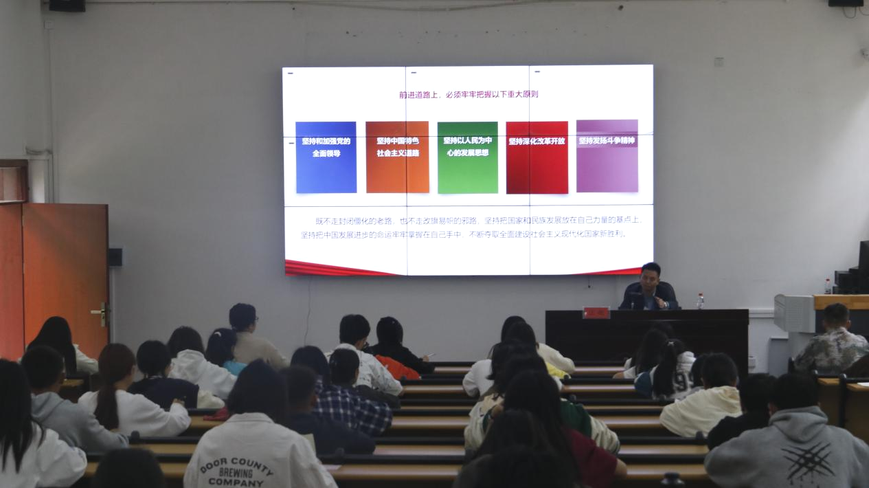 江屹围绕党的二十大的主题、过去五年工作和新时代十年的伟大变革等九个方面进行了宣讲,带领大家学习领会党的二十大的主要内容和精神内涵,为大家上了一堂生动的思政大课。宣讲过程中江屹用饱含深情、语重心长的话语鼓励我系学子要自信、肯奋斗、不躺平,认真规划工作和学习,紧贴专业、不断潜心钻研、突破自我,敢担当、不空谈,认真审时度势,树立远大理想,自觉担当重任,在全面建设社会主义现代化国家新征程上勇毅前行。