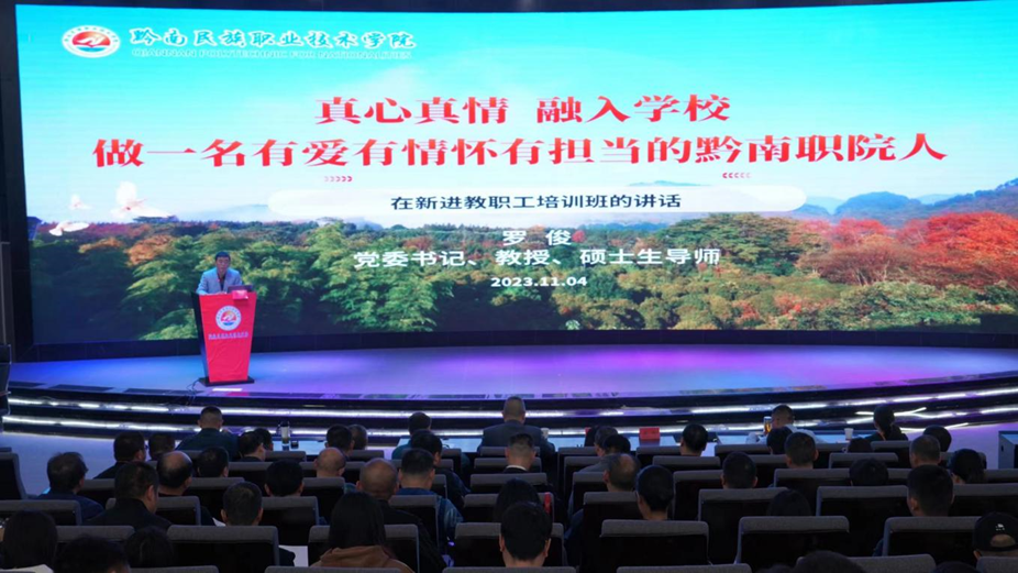 开班仪式结束后,院党委书记罗俊以《真心真情 融入学校 做一名有爱有情怀有担当的黔南职院人》为题作首场培训。他指出,教师培训是学院教师培养培训体系中重要环节,更是推动学院高质量发展的必然要求。中层干部、青年教师要深刻认识自己在教育强国、科技强国、人才强国建设中肩负的光荣使命与重大责任,在实践中牢固树立“躬耕教坛,强国有我”的志向与抱负。全体党员干部要以此为契机,以学增智,提升能力本领,为学院“双高”创建贡献力量。