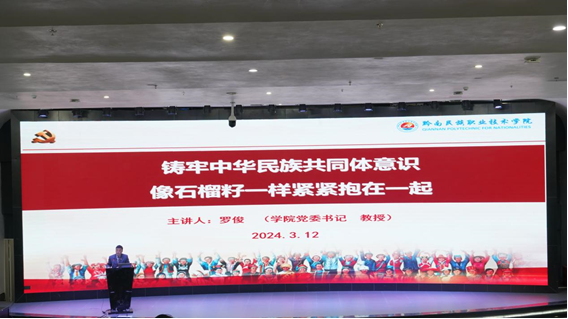 3月12日,学院党委书记罗俊以《铸牢中华民族共同体意识 像石榴籽一样紧紧抱在一起》为题,从“铸牢中华民族共同体意识的战略意义(为什么)”、“把握铸牢中华民族共同体意识的丰富内涵 (是什么)”和“铸牢中华民族共同体意识的实践路径 (如何做)”三方面,为全体思政课教师、辅导员代表及师生代表上了一堂厚植青年学生爱党、爱国、爱社会主义、爱人民、爱集体的真挚情感的“开学第一课”。