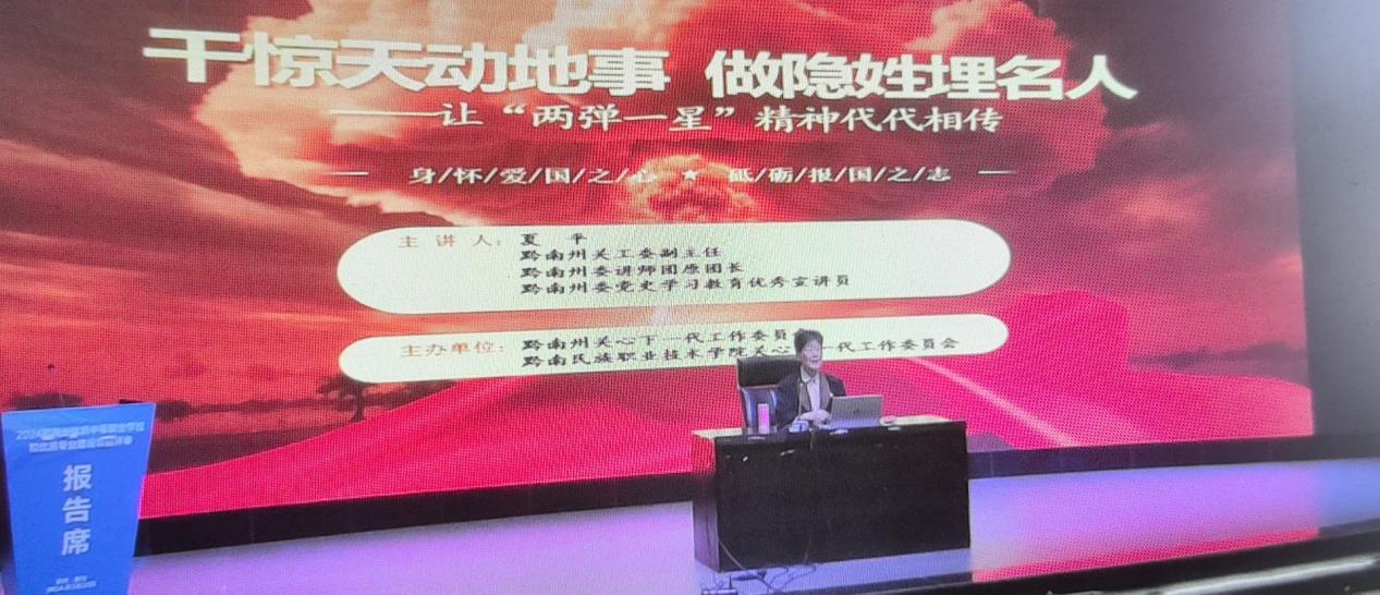 黔南州关工委常务副主任、州人大原副主任丁匀,学院关工委副主任、原党委副书记、纪委书记吴庆颐,学院关工委副主任、原招生就业处副处长蒙明洲,学院组织人事部犹琴部长与全院300余名同学齐聚学术报告厅,聆听由黔南州关工委副主任、州委讲师团原团长夏平带来的《“干惊天动地事·做隐名埋名人”——让“两弹一星”精神代代相传》的专题讲座。