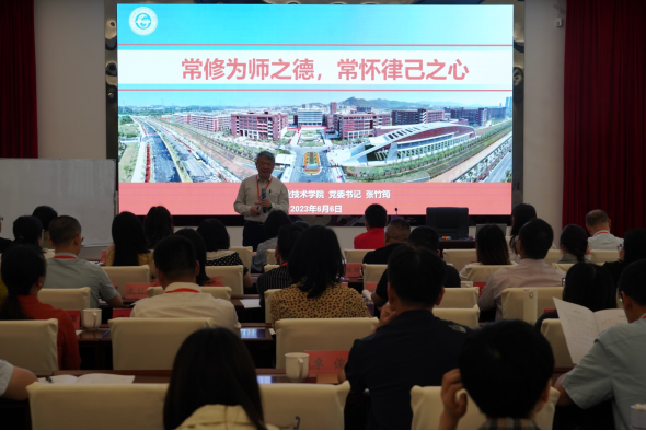 6月6日,教育部召开师德师风建设工作推进暨师德集中学习教育启动部署会。为加强师德师风建设,广州铁路职业技术学院党委书记张竹筠以“常修为师之德 常怀律己之心”为题,在黔南民族职业技术学院知行楼六楼道德讲堂给广州铁路职业技术学院“双带头人”党支部书记和组织委员创优培训班上了一堂生动的师德师风教育课。