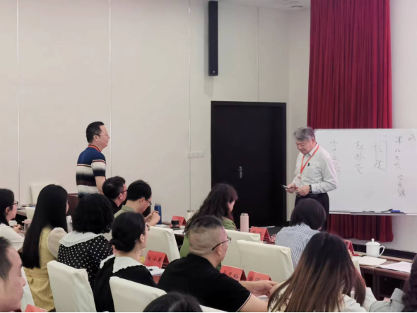 张竹筠书记旁征博引、由古及今,以丰富的学识、深刻的见解、精彩的案例深入浅出的阐明了师德师风的重要性,体现了“大先生”的风范,赢得了学员们的掌声。授课后,张竹筠书记与参训学员进行互动交流,就师德建设、学生五育教育等问题进行深刻的探讨。