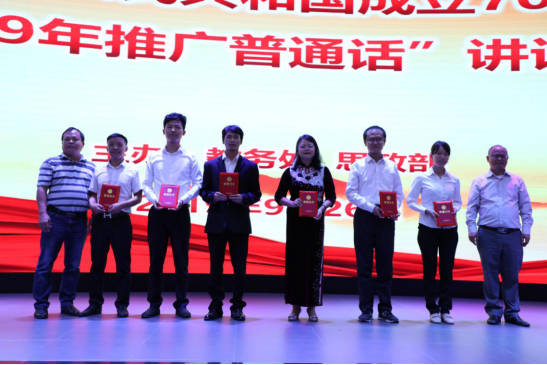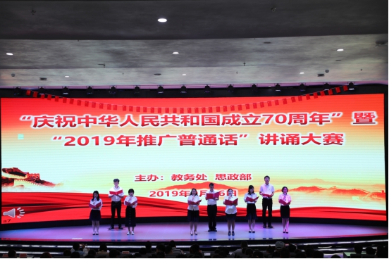 为隆重庆祝中华人民共和国成立70周年,进一步加强大学生爱国主义教育,激发大学生爱国情感,凝聚爱国力量,增强四个自信,9月26日晚上,由教务处、思政部共同举办的“庆祝中华人民共和国成立70周年”暨“黔南职院2019年推广普通话”讲诵比赛在学院学术报告厅举行。