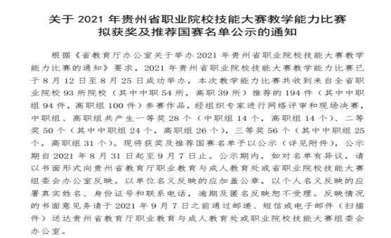 近日,由贵州省教育厅组织的2021年贵州省职业院校技能大赛教学能力比赛,经省级网络评审、现场决赛等环节,共评出高职组一等奖14个,二等奖26个,三等奖31个。我院高职公共基础课程组兰婷婷、韦睿、徐瑞芳、陈洪升教师团队,高职专业课程一组谢伟、周璐、陈桂斌、徐朝升教师团队,高职专业课程二组南雪芹、罗来银、陈悦沁、冯霞教师团队均荣获二等奖。