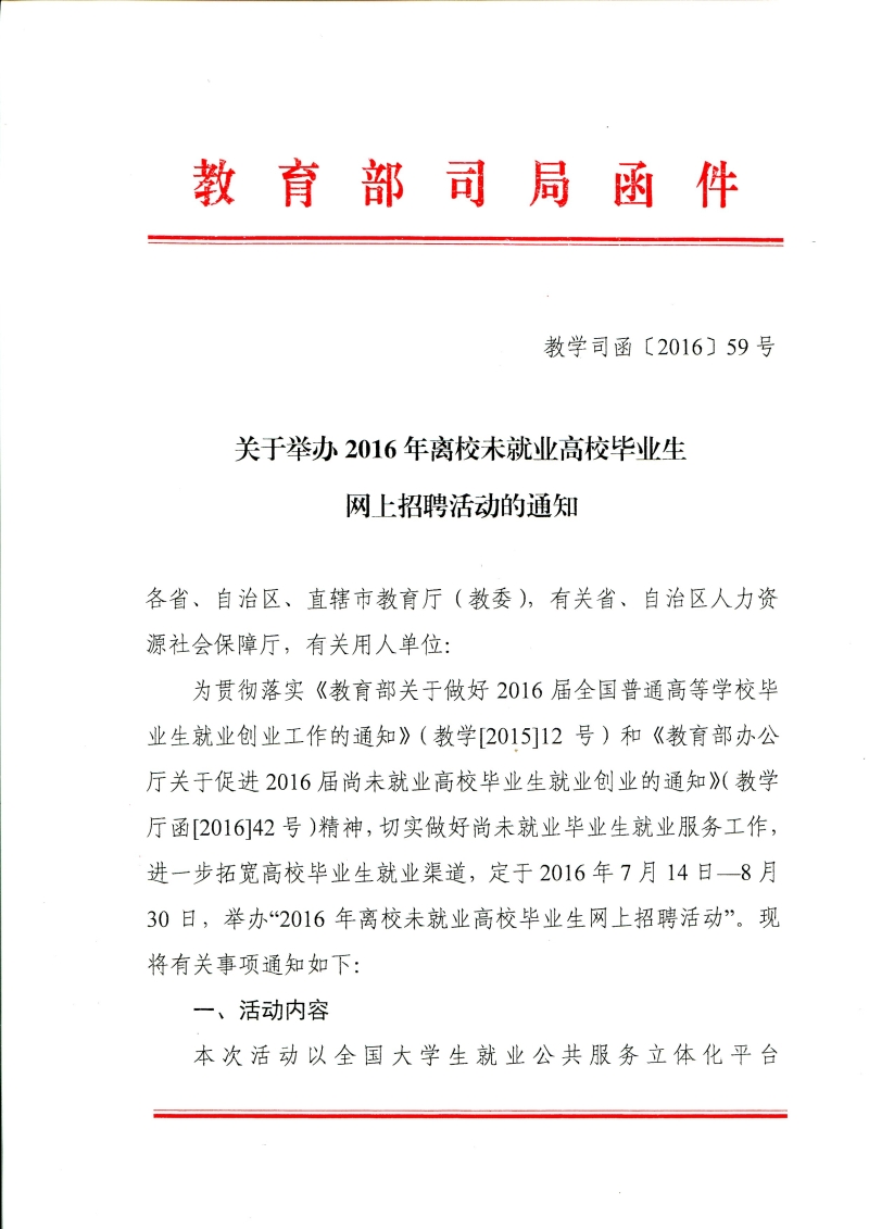 现将“关于举办2016年离校未就业高校毕业生网上招聘活动的通知” (教学司函【2016】59号)转发给你们,请联系和组织我院2016届离校未就业毕业生参加网上招聘活动,以促进我院2016届离校未就业毕业生尽快实现就业。