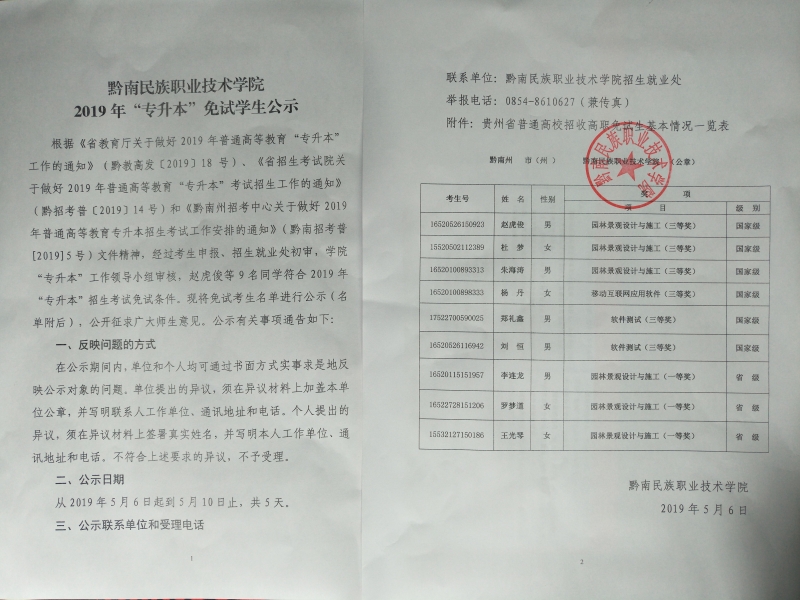 黔南民族职业技术学院2019年“专升本”免试学生公示