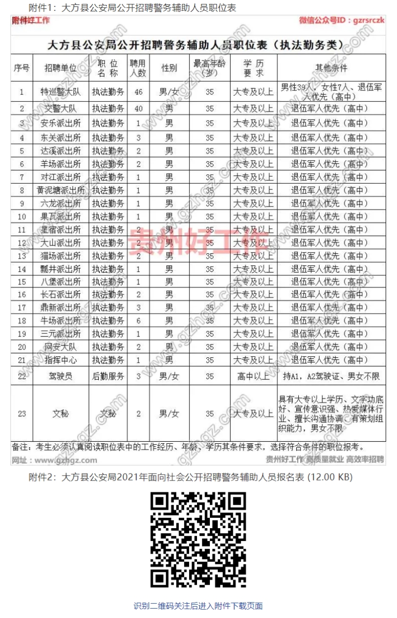 招聘职位(具体见附件1:大方县公安局公开招聘警务辅助人员职位表)。