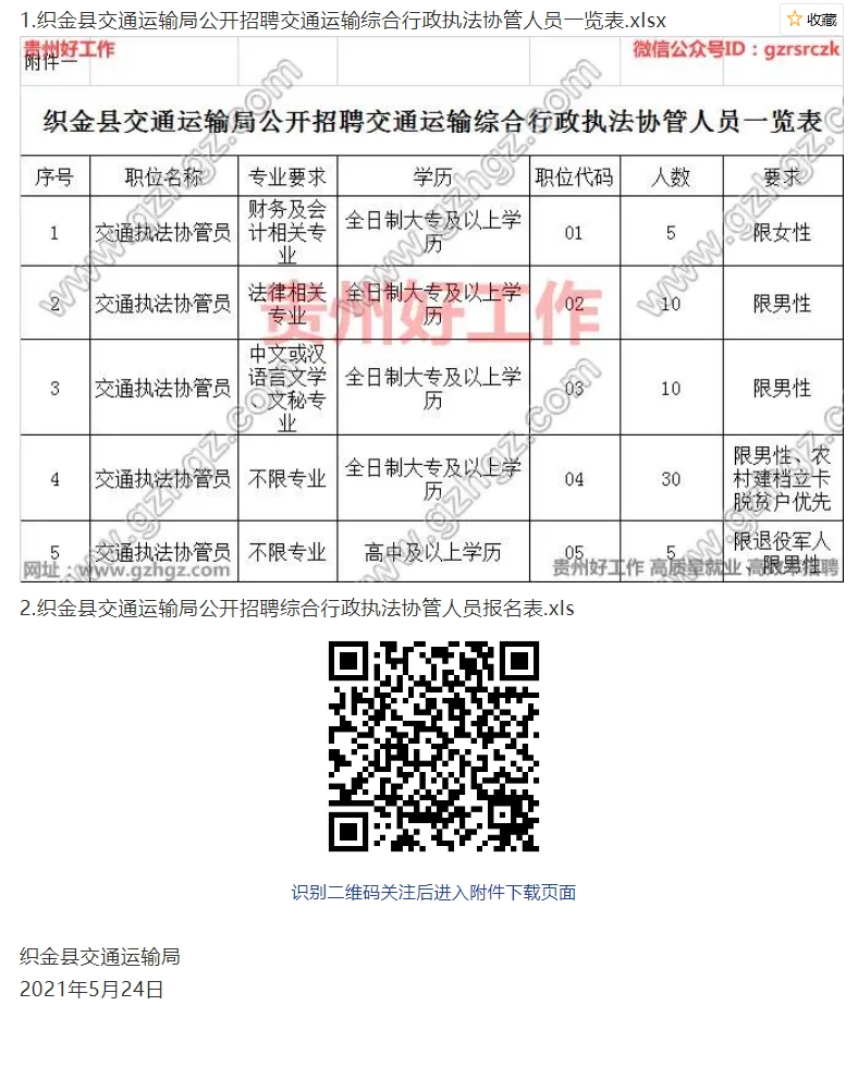 (一)本次招聘交通执法协管人员采取现场报名的方式进行,招聘公告在织金县人民政府门户网站(网址:http://www.gzzhijin.gov.cn/)进行公布,公布时间为2021年5月24日至2021年5月27日。