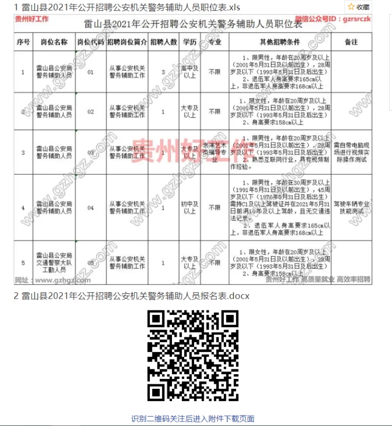 (1)雷山县公安局特巡警大队01职位,限男性,年龄在20周岁及以上(2001年5月31日及以前出生),28周岁及以下(1993年5月31日及后出生),具备高中及以上学历,退伍军人身高要求165cm以上,非退伍军人身高要求168cm以上 。