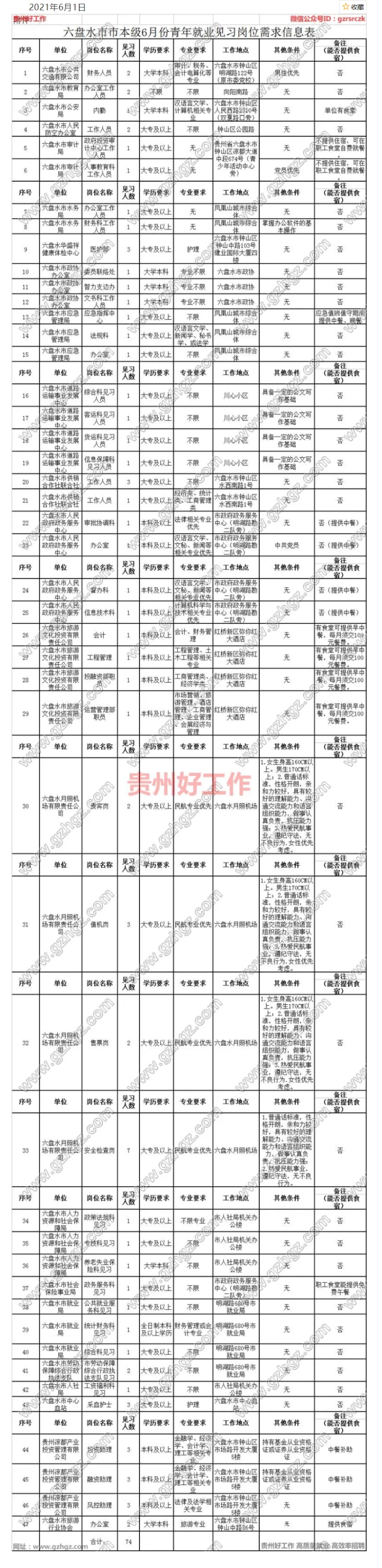 六盘水市市本级6月征集就业见习岗位47个,招募就业见习人员74名。