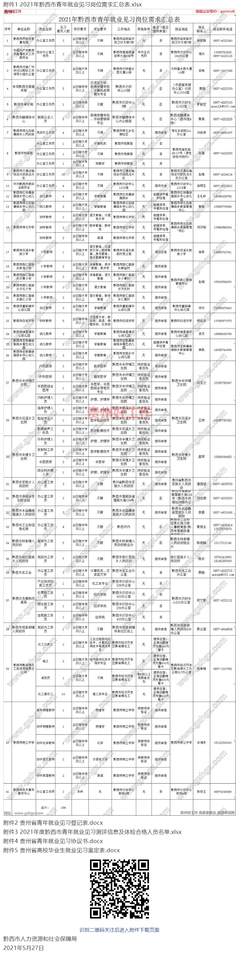 我市共需招募见习人员159名,详见《2021年黔西市青年就业见习岗位需求汇总表》(附件1)。