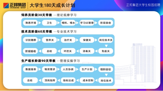 1、根据180天的培养计划进行生猪养殖技术理论以及实操学习,并通过考试,从饲养员-技术员-分厂长进行晋升;