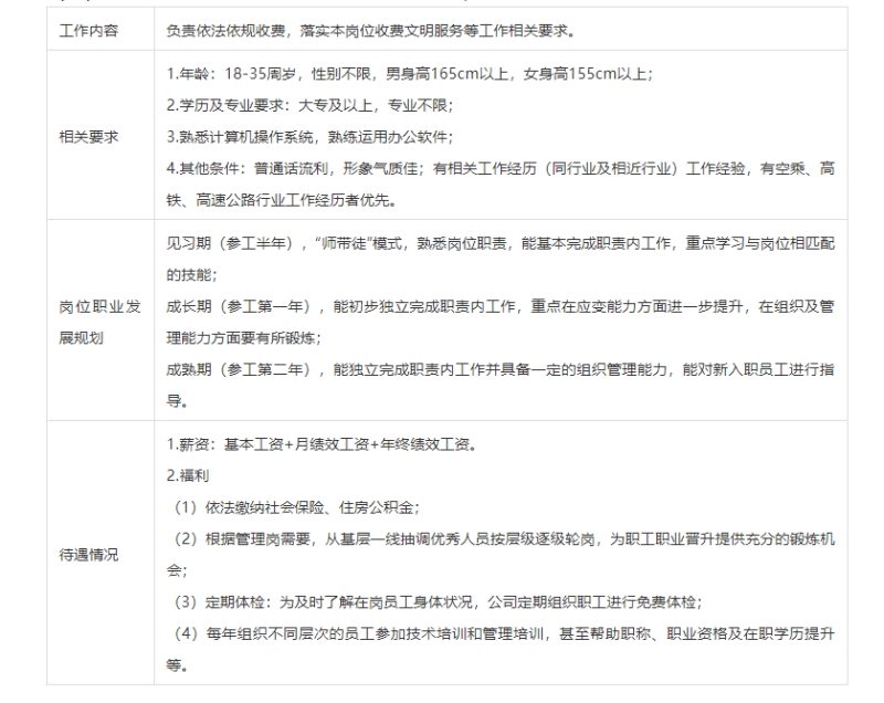 (一)招聘岗位:高速公路收费员。