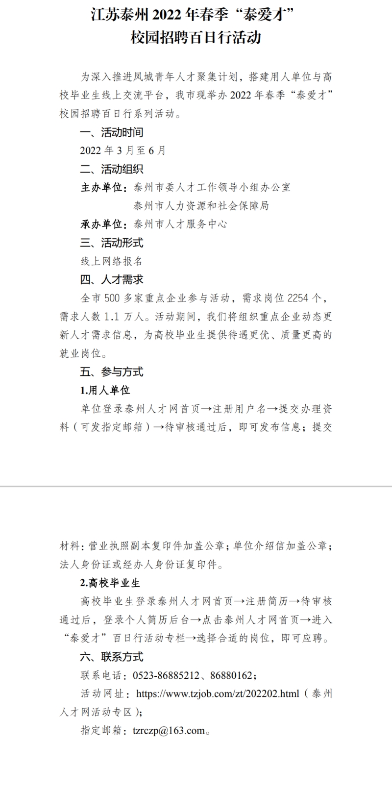 江苏泰州2022年春季“泰爱才”校园招聘百日行活动