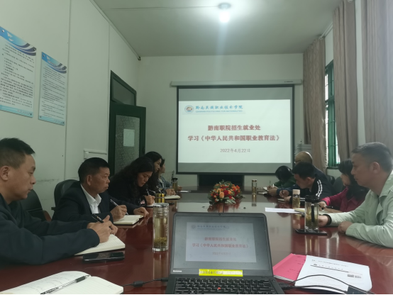2022年4月20日,十三届全国人大常委会第32次会议上表决通过了新修订《中华人民共和国职业教育法》,为深入理解国家职业教育政策。 4月22日上午,招就处全体成员在会议室组织集中学习。