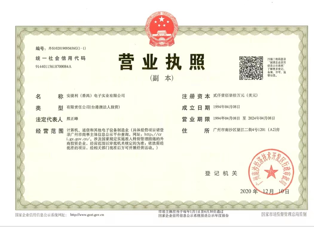 安捷利(番禺)电子实业有限公司,1994年4月8日成立,经营范围包括集成电路制造;集成电路设计,线宽28纳米及以下大规模数字集成电路制造,0.11微米及以下模拟、数模集成电路制造,MEMS和化合物半导体集成电路制造及BGA、PGA、CSP 、MCM等先进封装与测试;光电子器件及其他电子器件制造;计算机应用电子设备制造;销售本公司生产的产品(国家法律法规禁止经营的项目除外;涉及许可经营的产品需取得许可证后方可经营)电子元器件批发,电子产品批发,印制电路板制造,电子元件及组件制造,集成电路设计,货物进出口(涉及外资准入特别管理规定和许可审批的商品除外)。