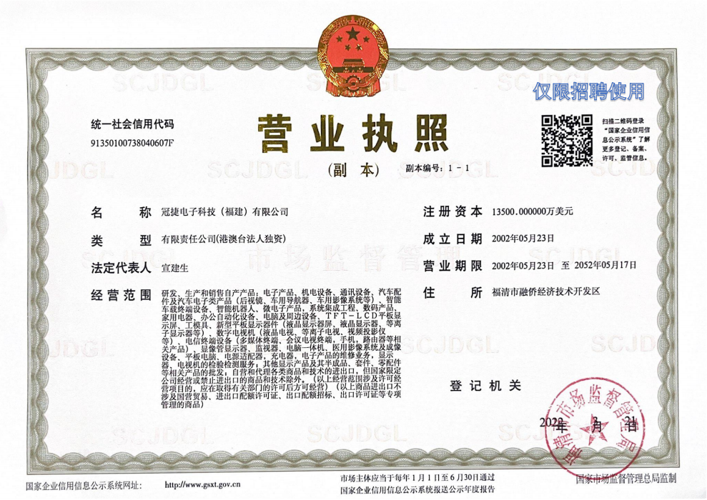 二、企业简介:冠捷科技集团于 1990 年在福建福清投资建厂,投资金额9980万美元,注册资本4500万美元,位于福建省福州市五区八县之三福之地福清。公司坐落于福清融侨经济技术开发区,拥有近60万平方米的研发和生产基地,主要从事液晶显示器、电子 白板、监视器等显示类产品研发、制造,员工人数约 1 万人。