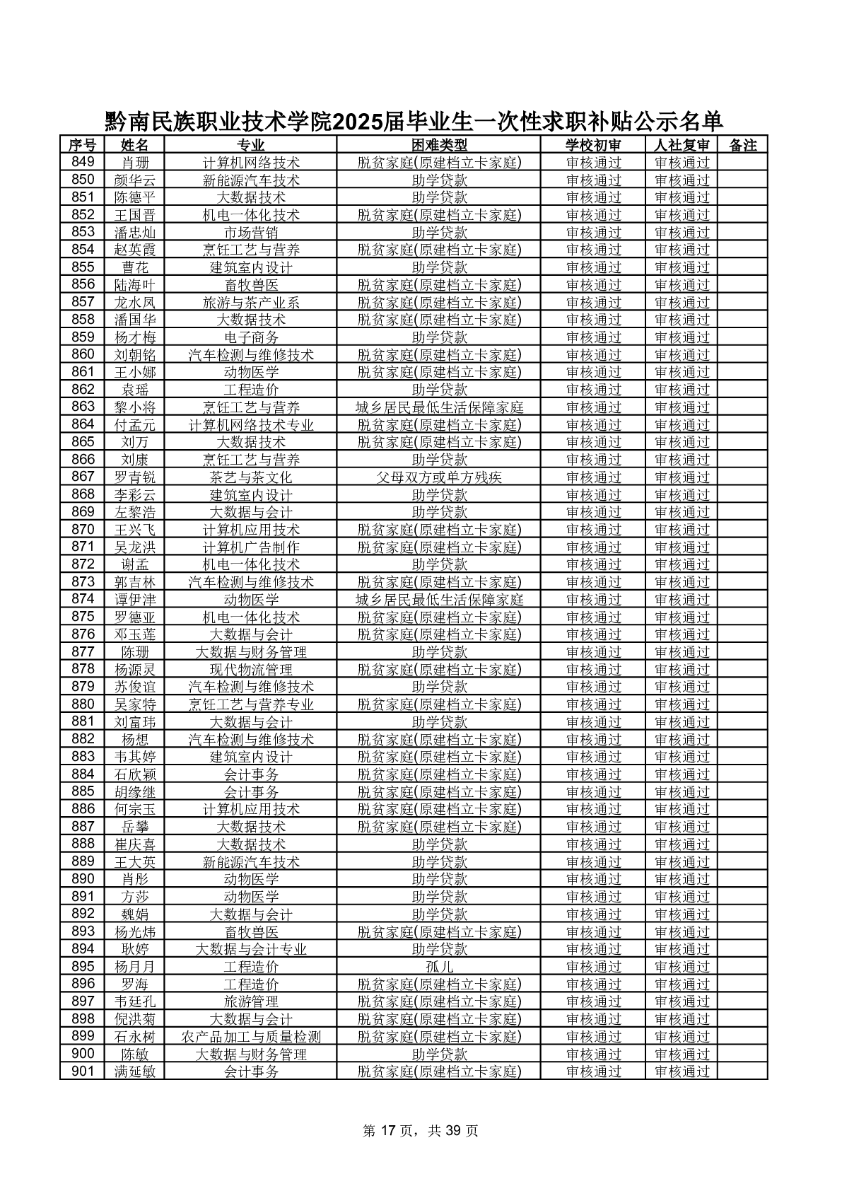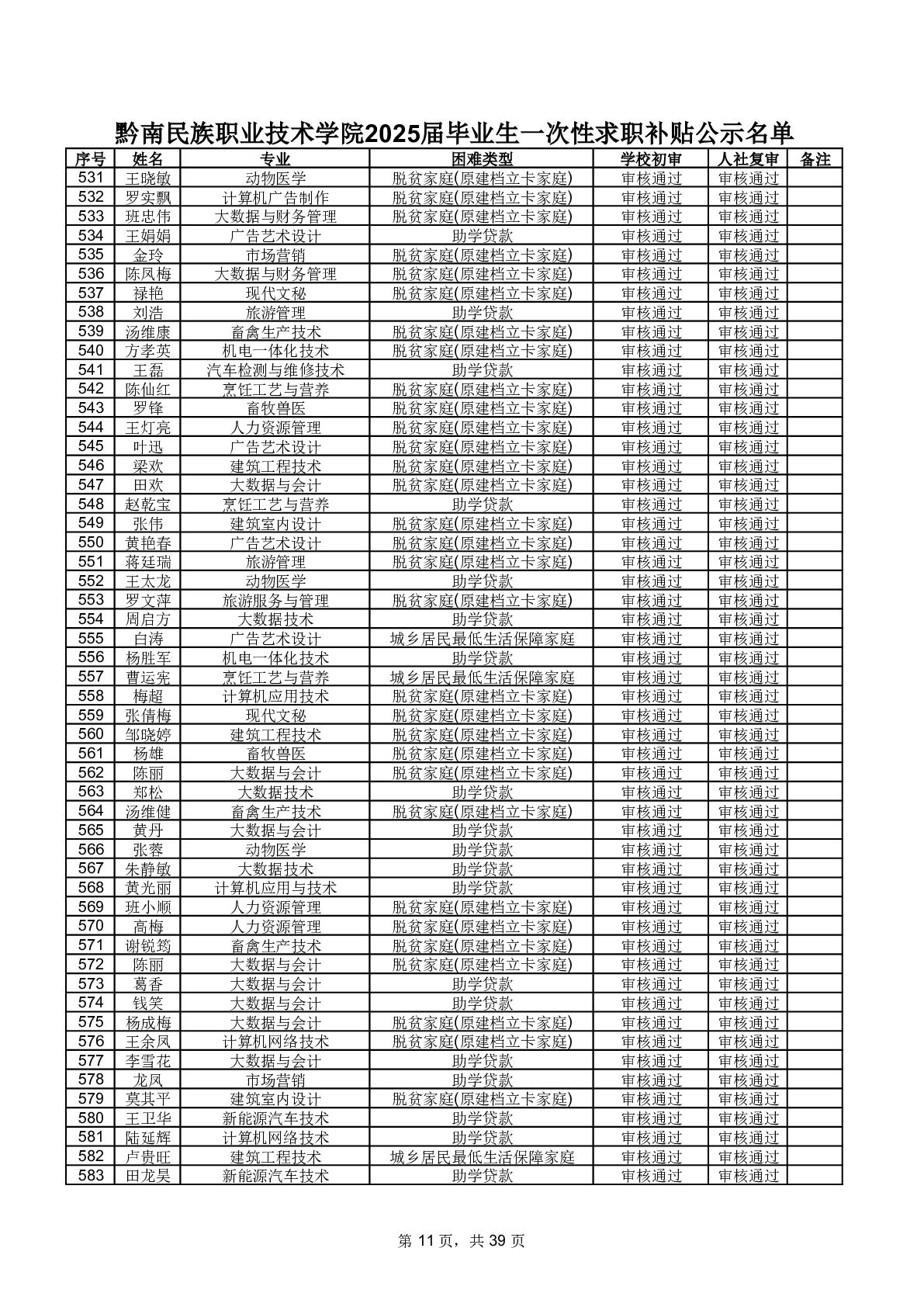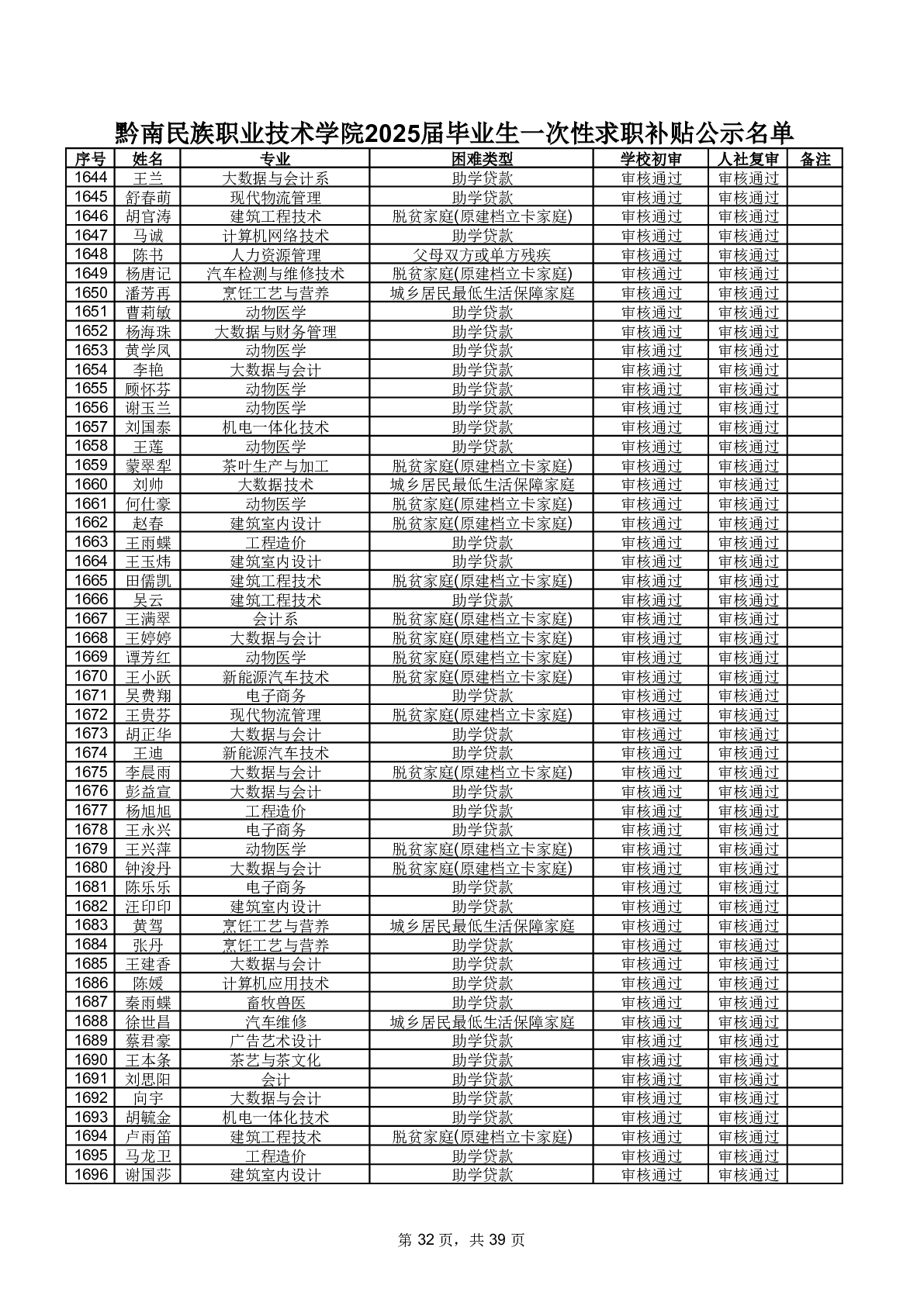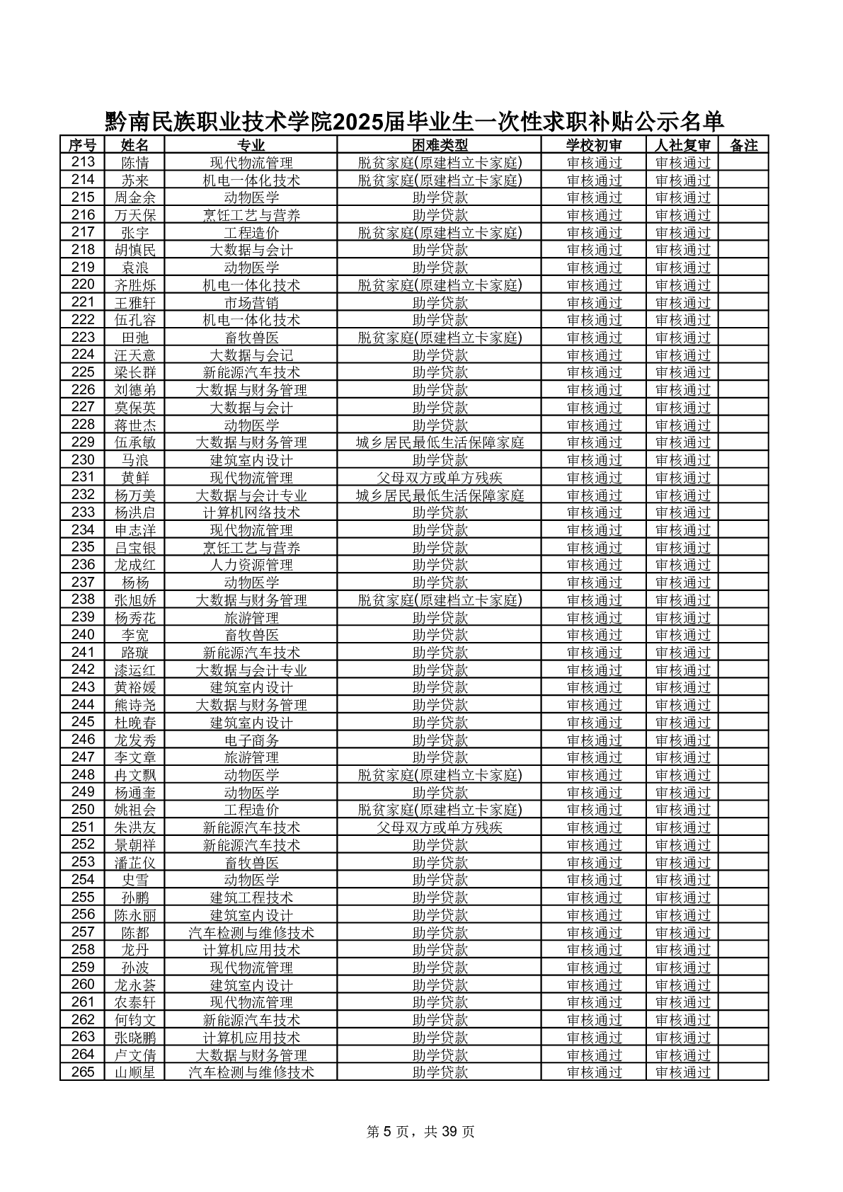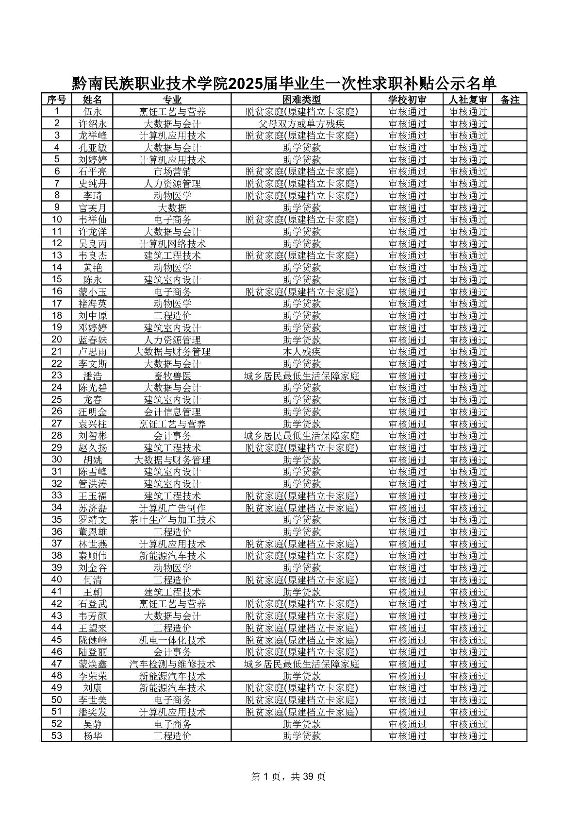黔南民族职业技术学院2025届毕业生 一次性求职补贴申请审核通过公示