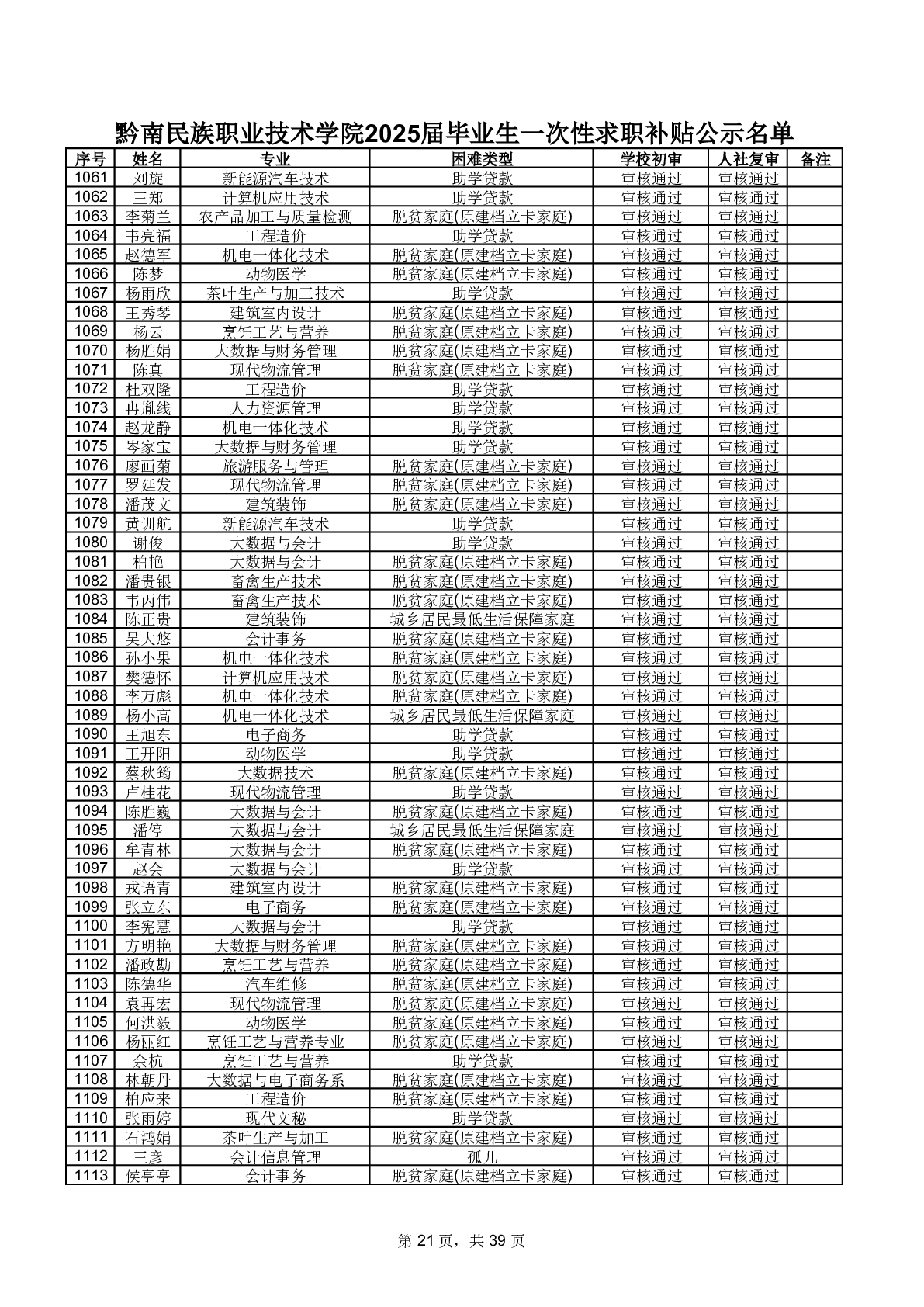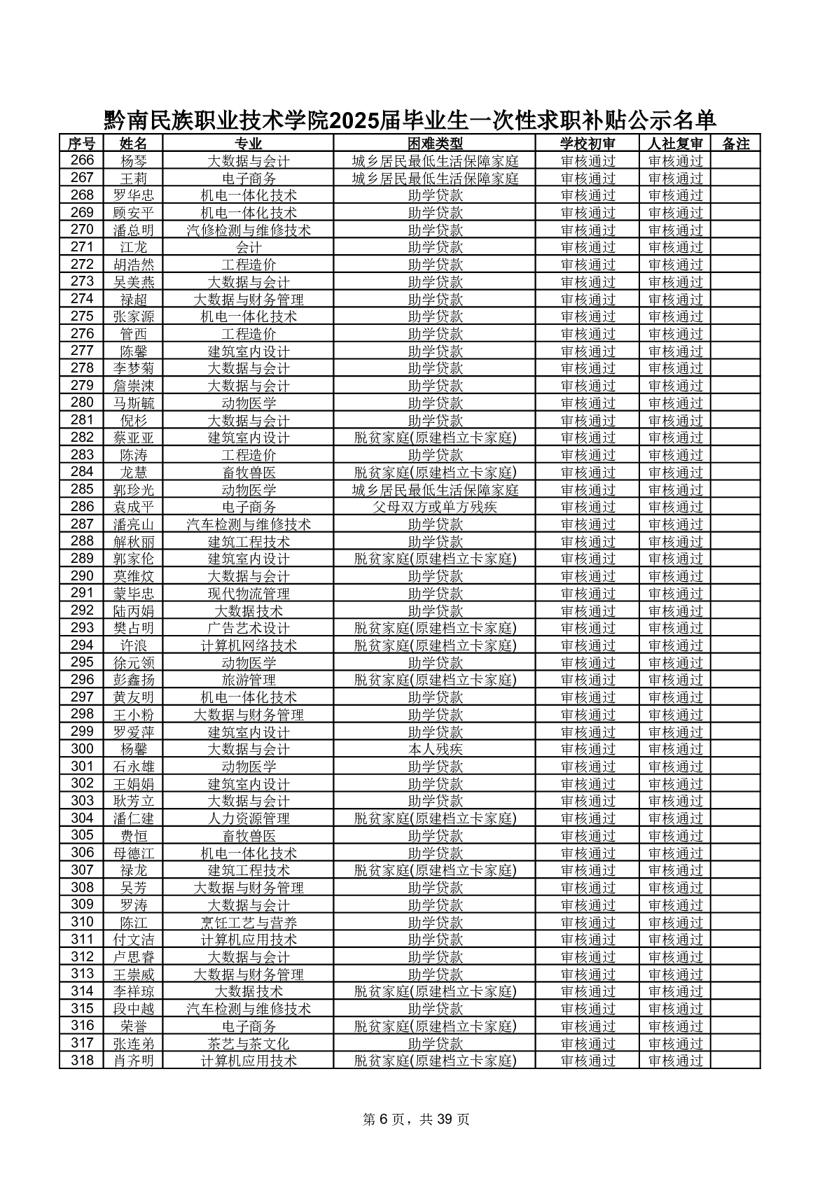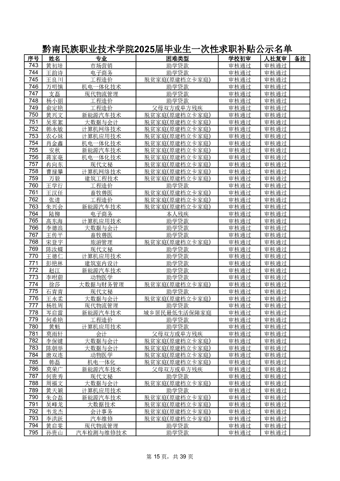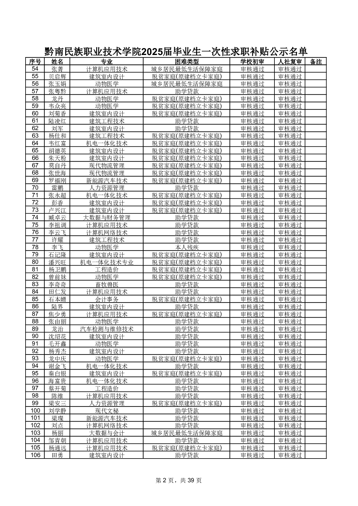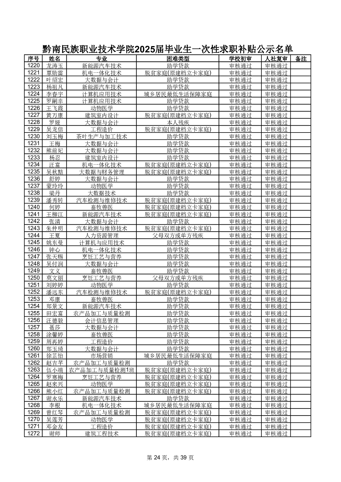 黔南民族职业技术学院2025届毕业生 一次性求职补贴申请审核通过公示