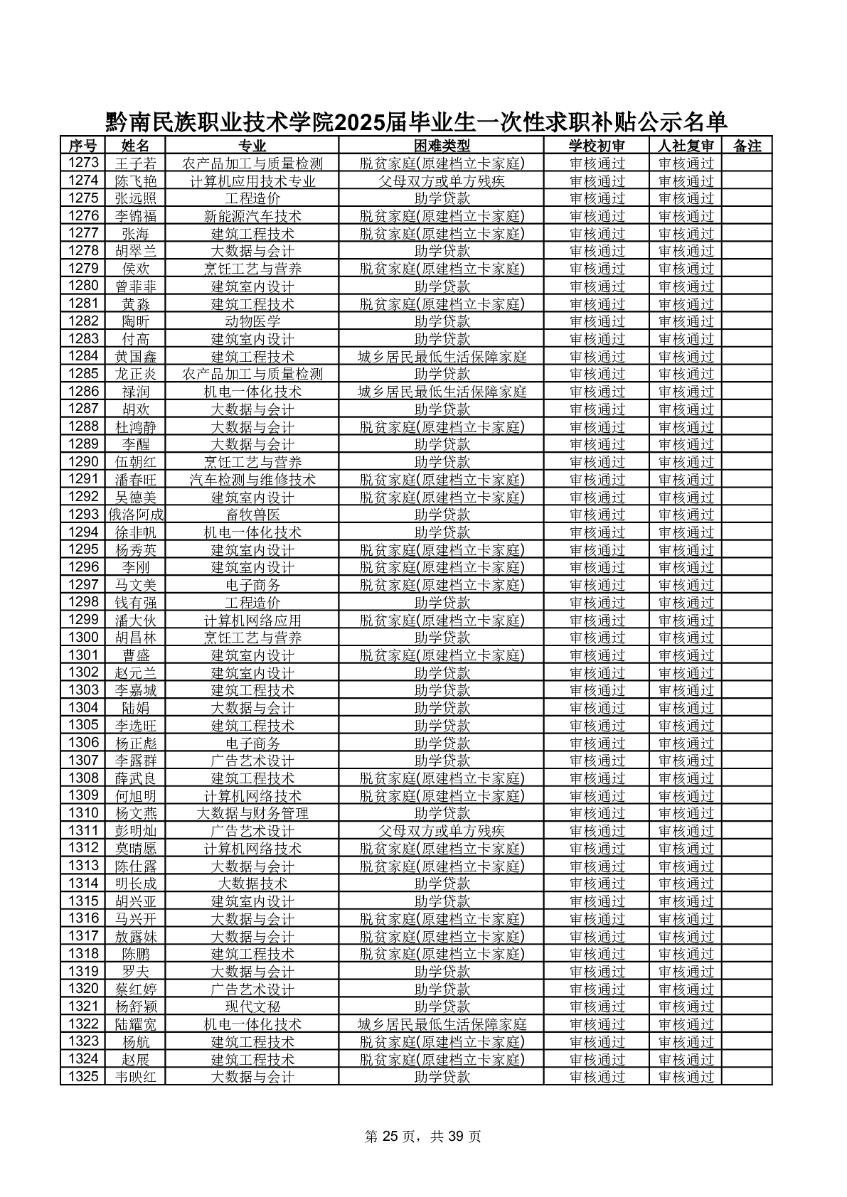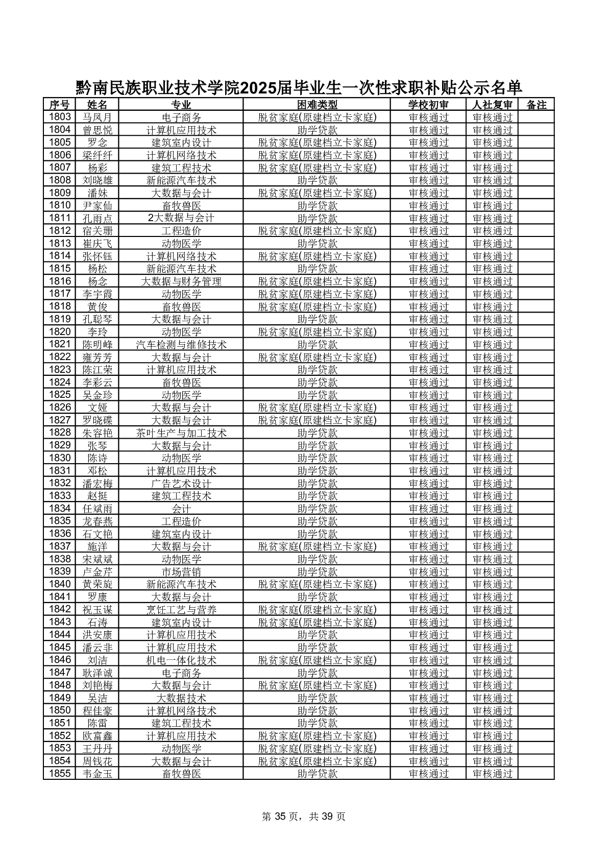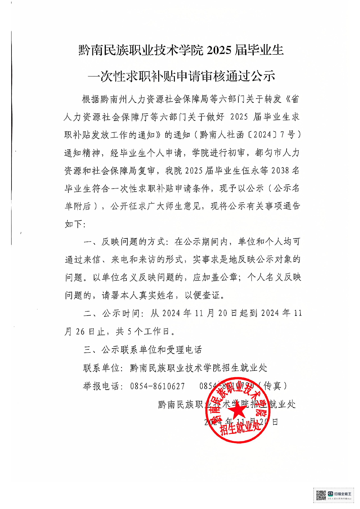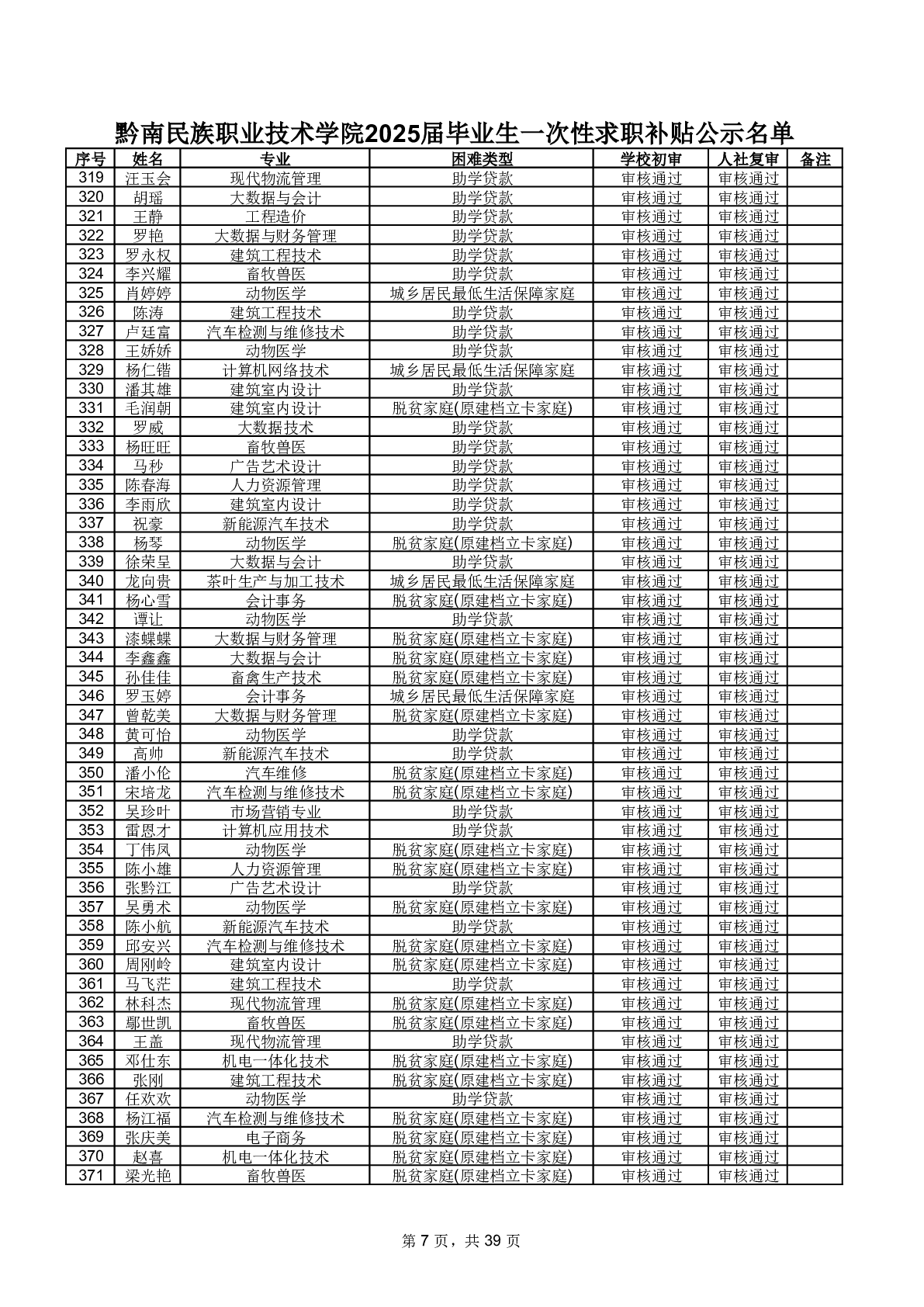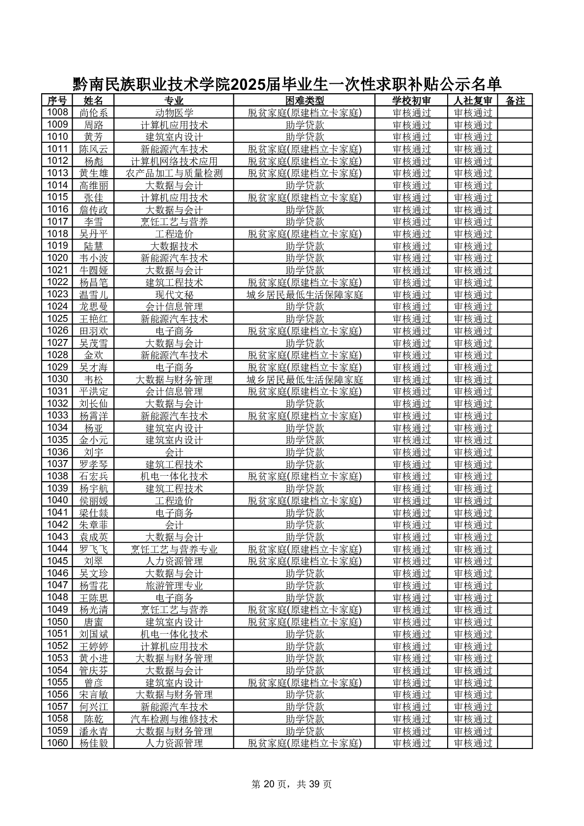 黔南民族职业技术学院2025届毕业生 一次性求职补贴申请审核通过公示