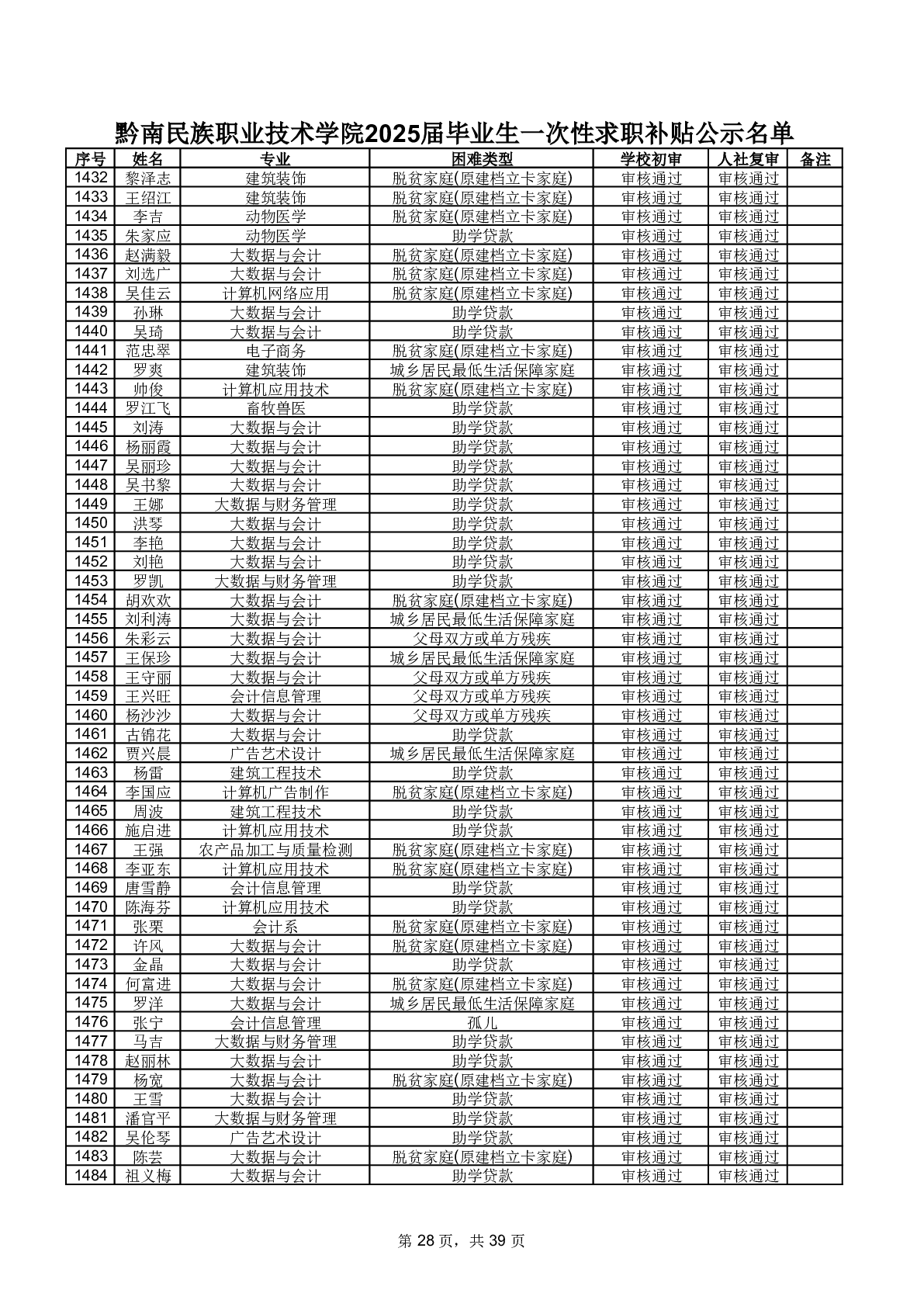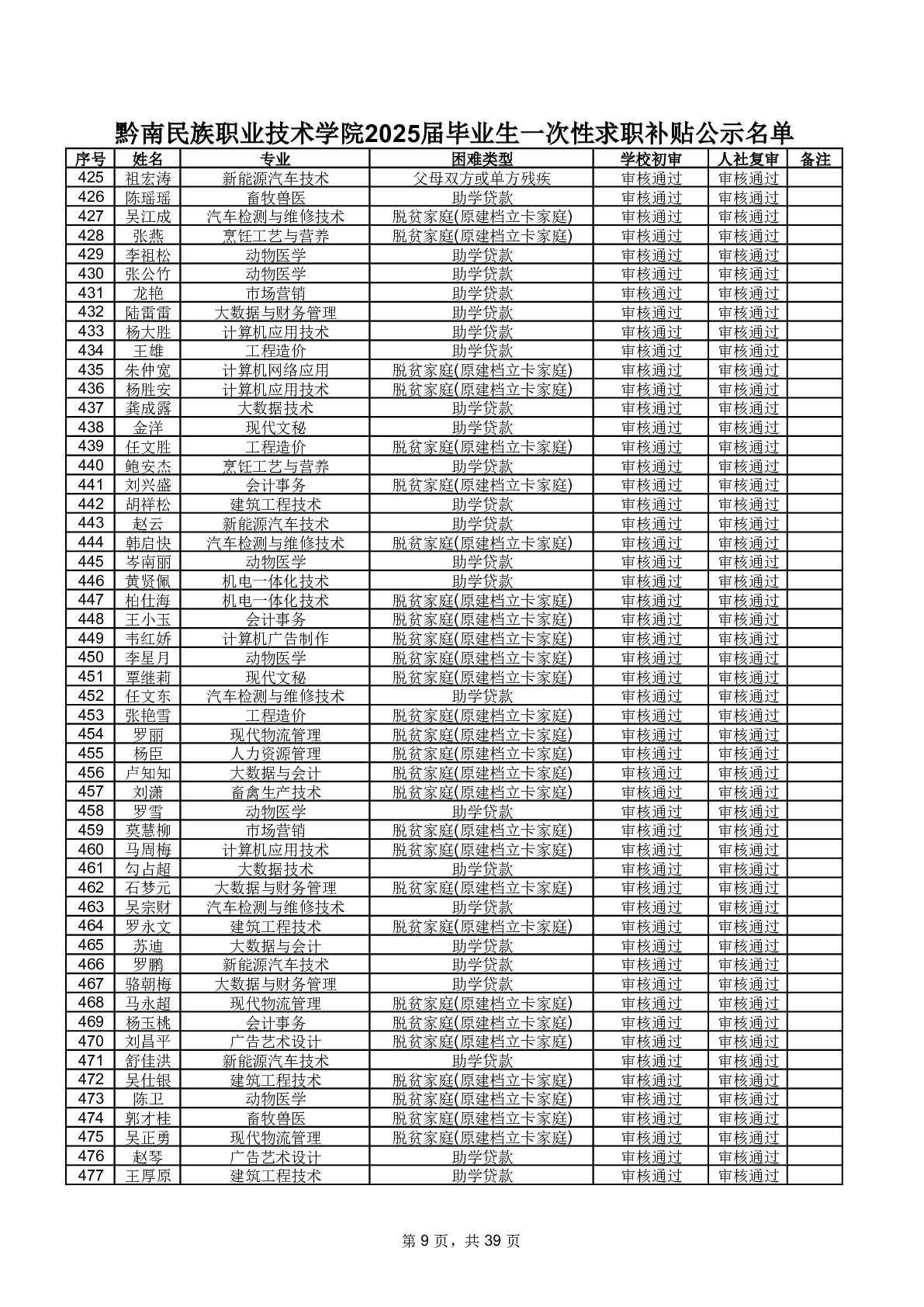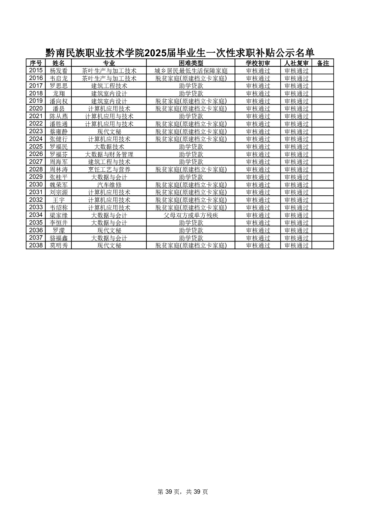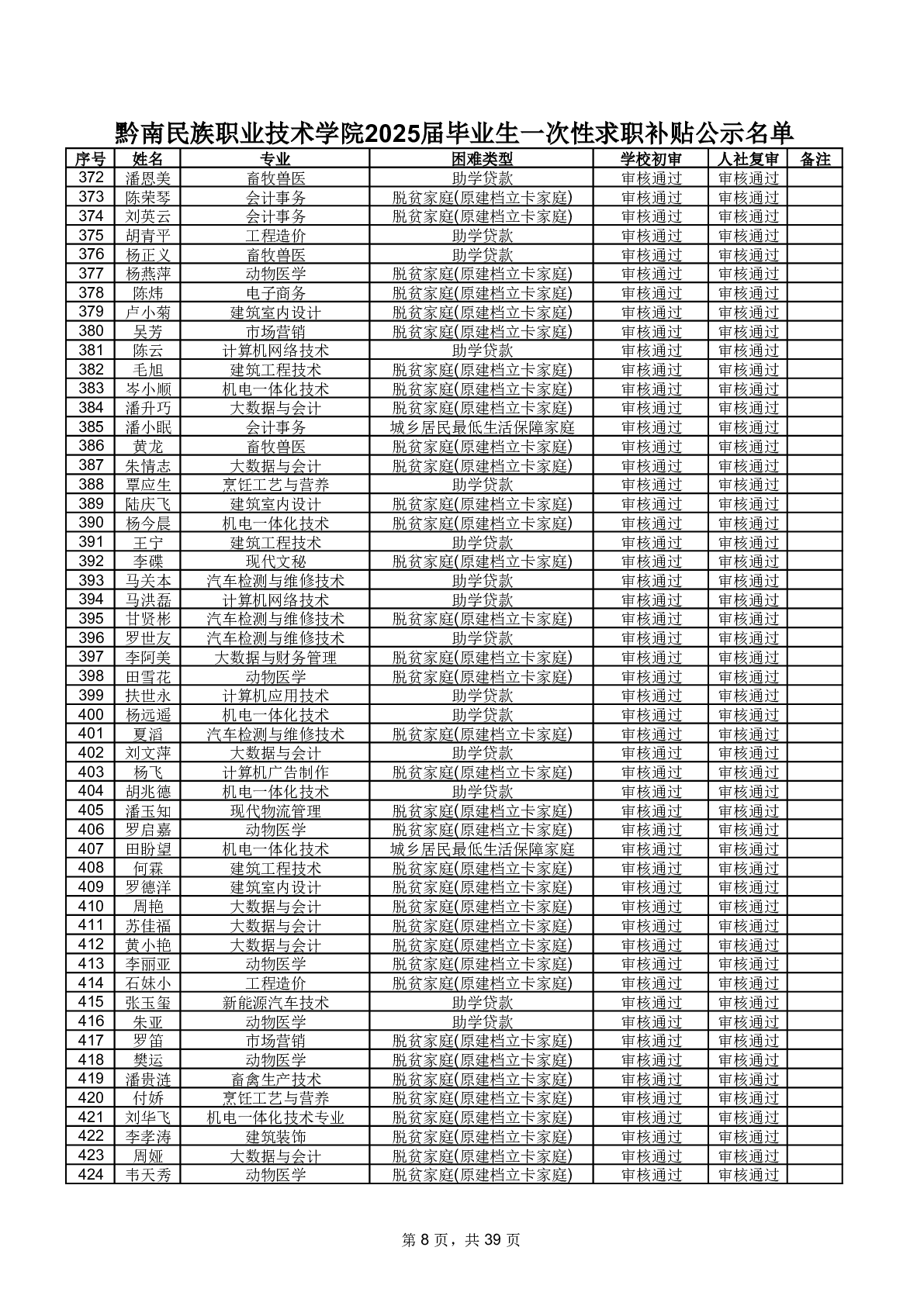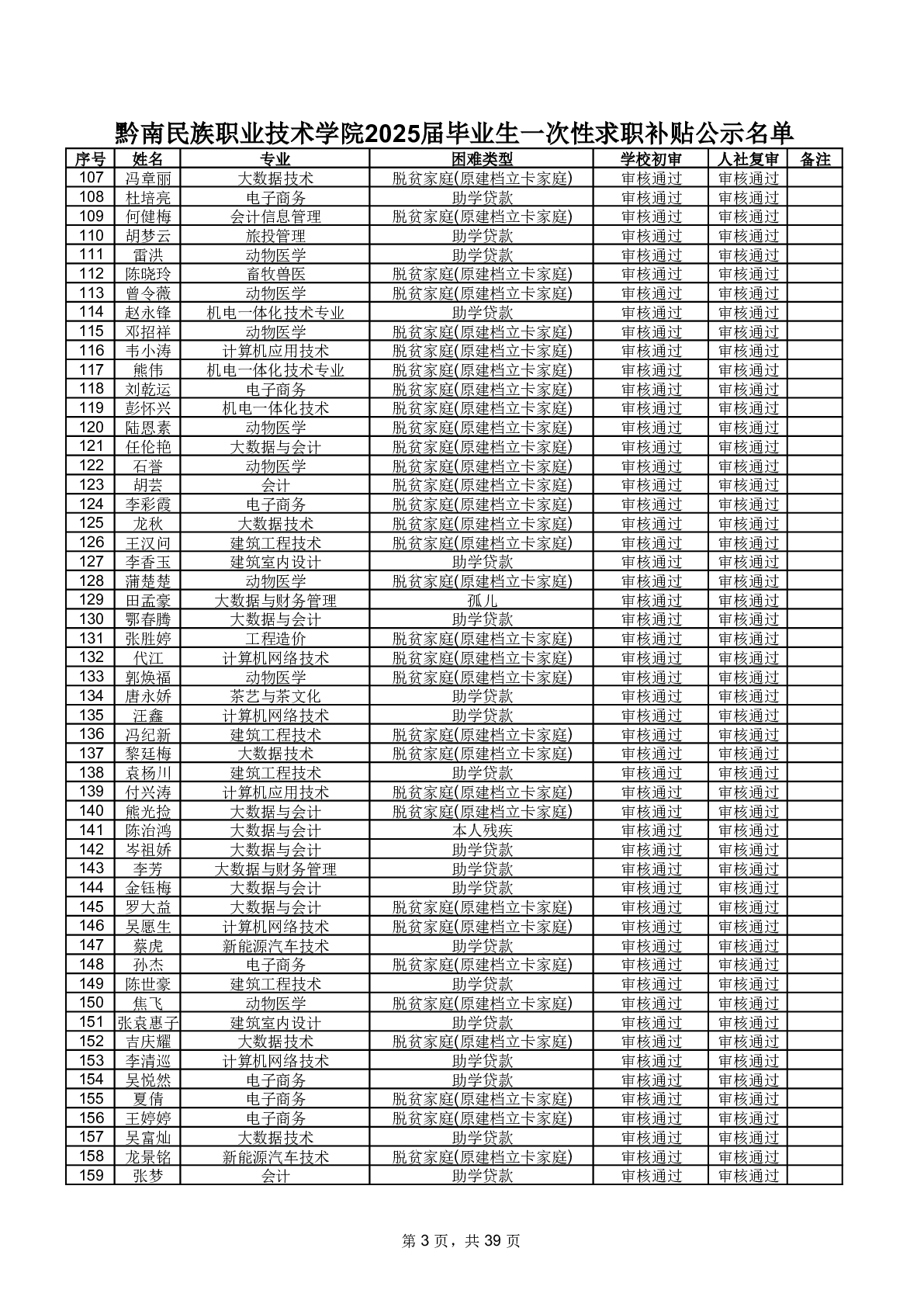 黔南民族职业技术学院2025届毕业生 一次性求职补贴申请审核通过公示