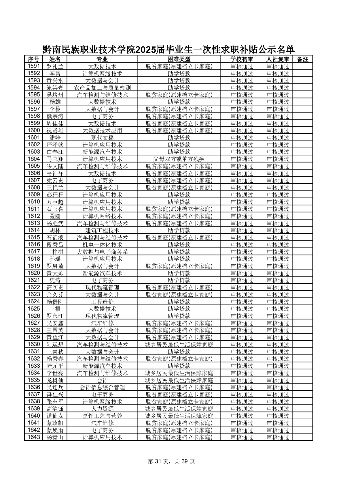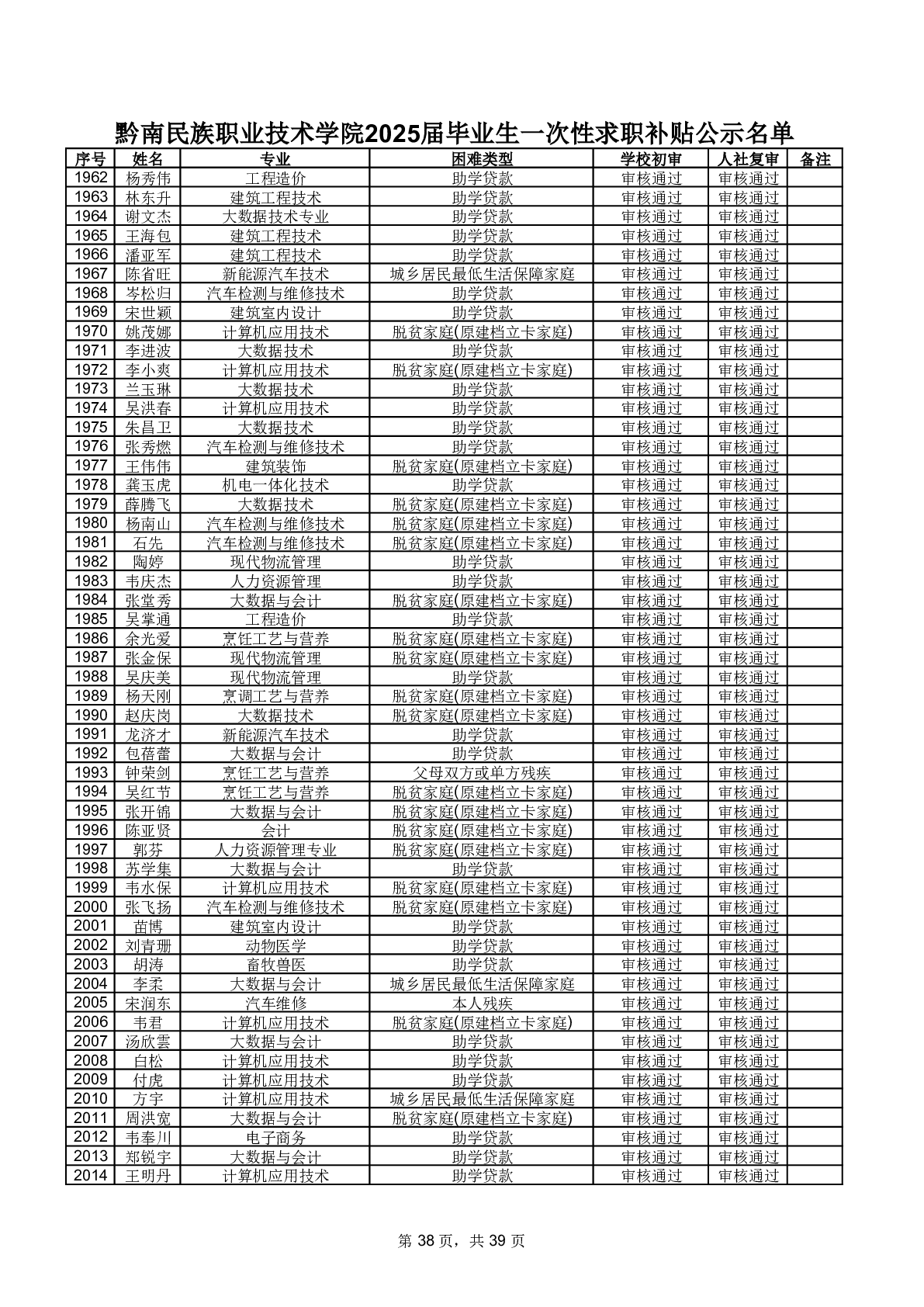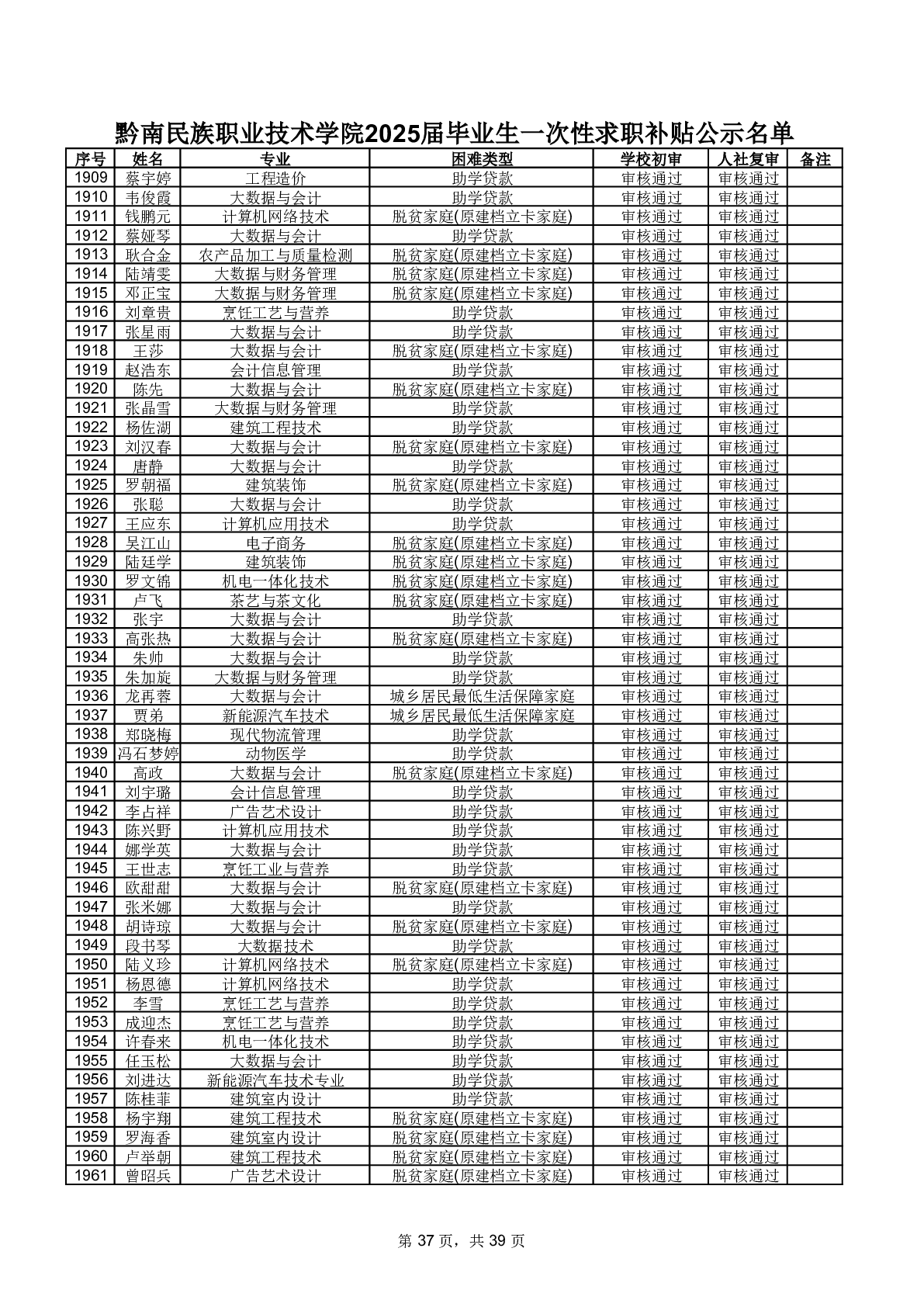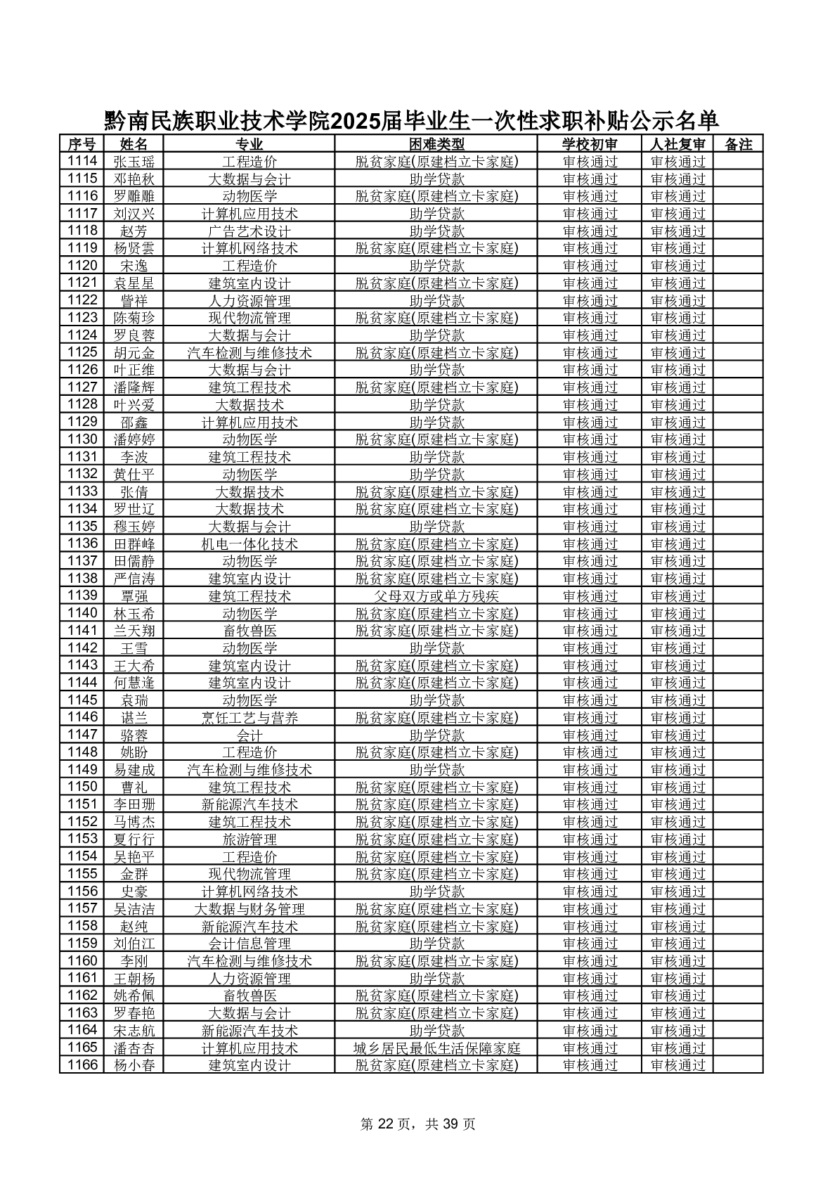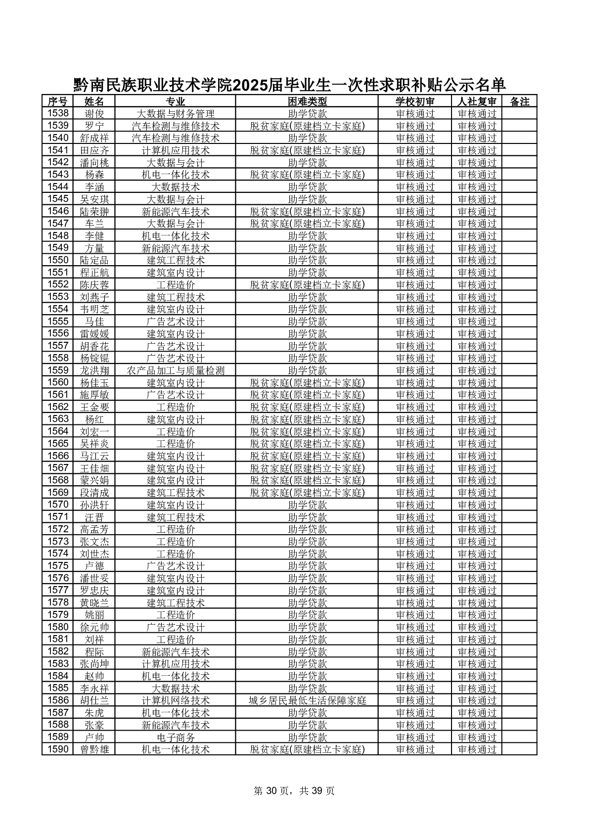 黔南民族职业技术学院2025届毕业生 一次性求职补贴申请审核通过公示