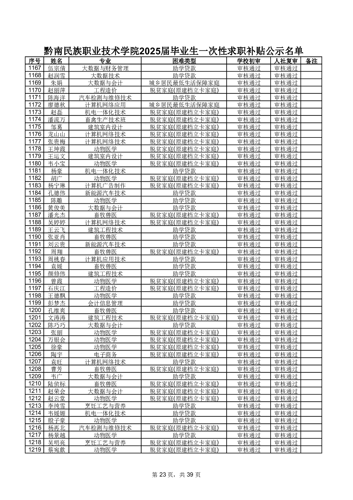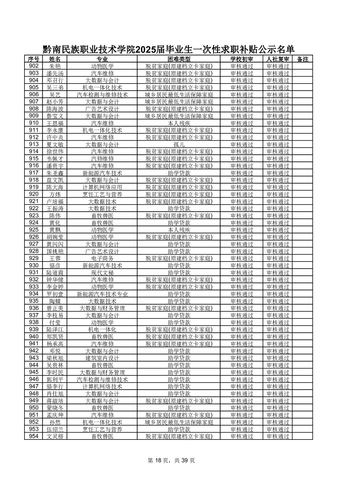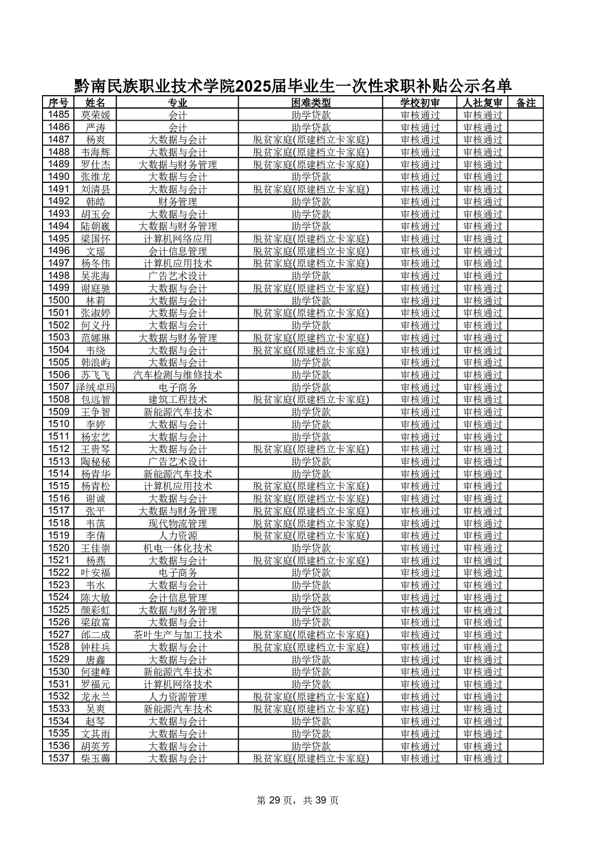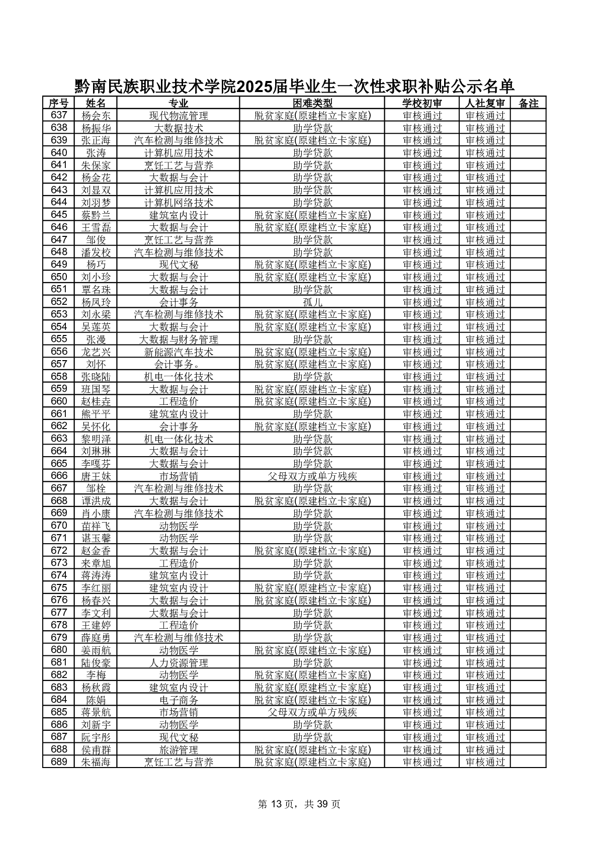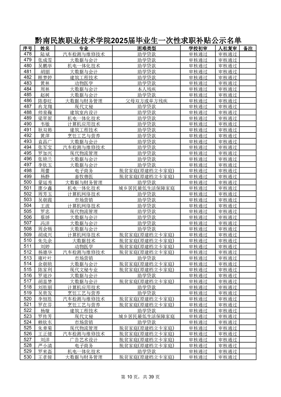 黔南民族职业技术学院2025届毕业生 一次性求职补贴申请审核通过公示