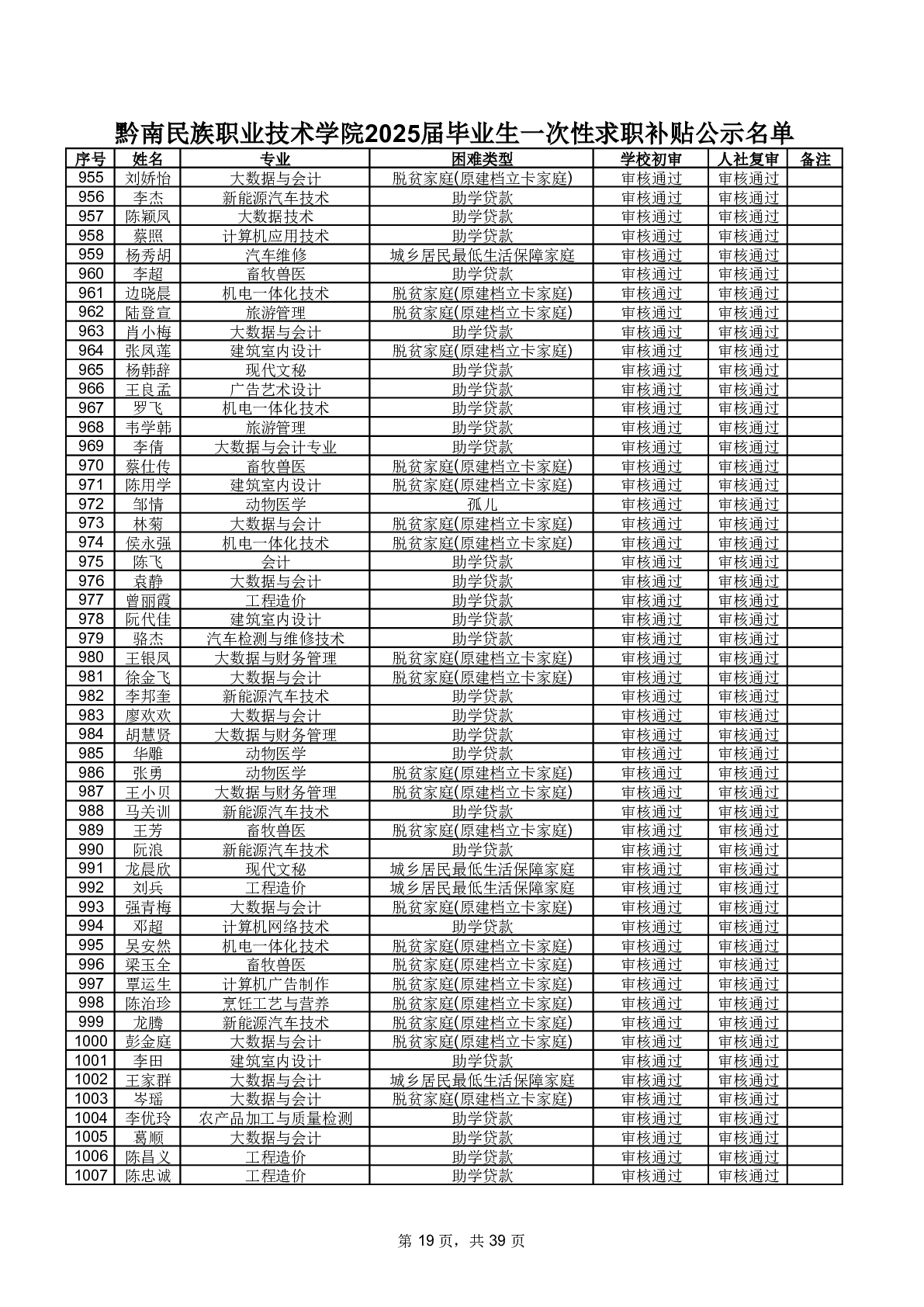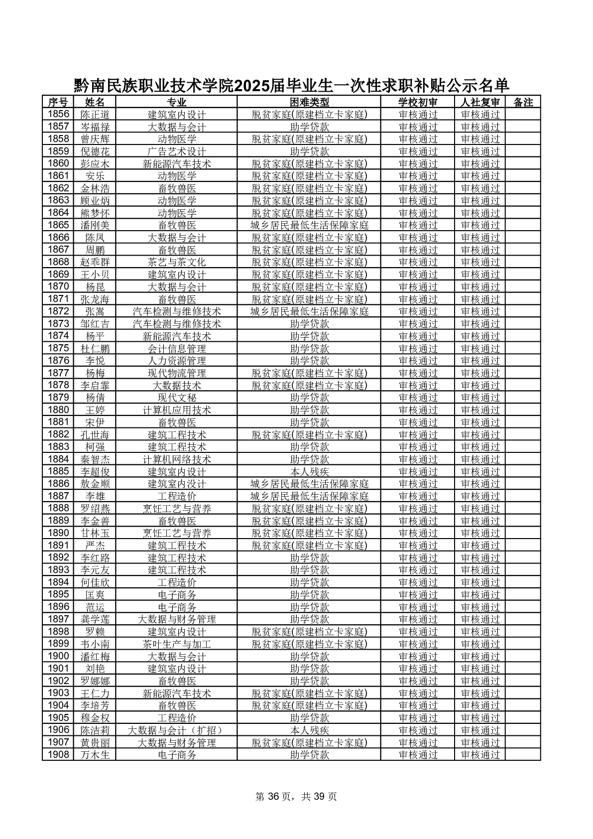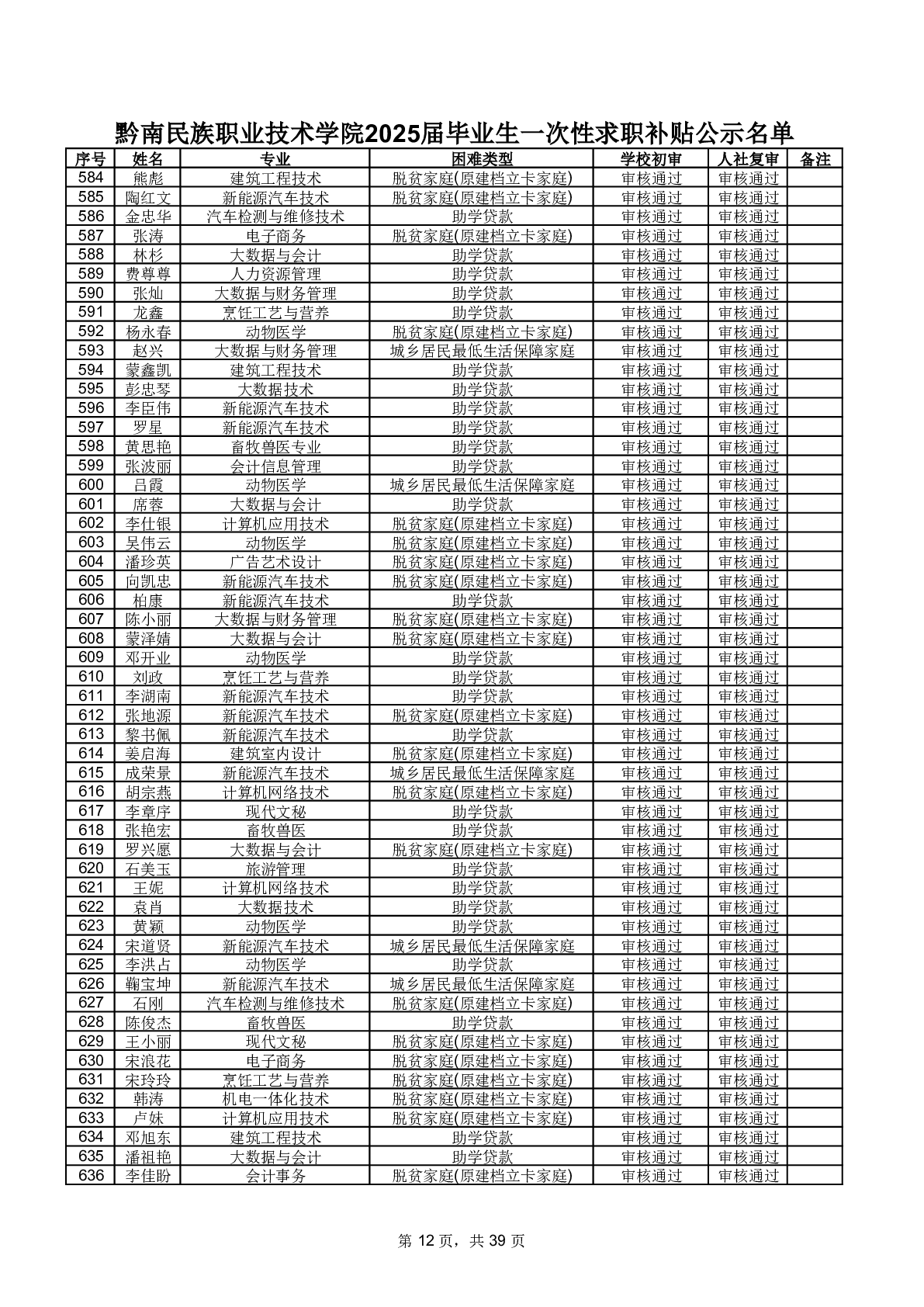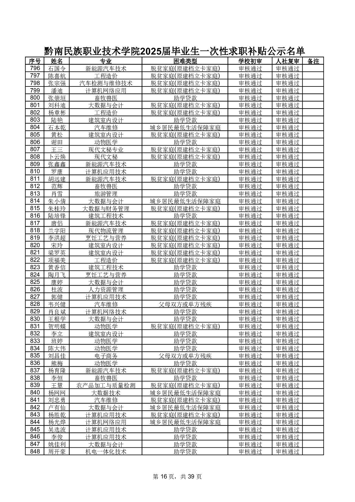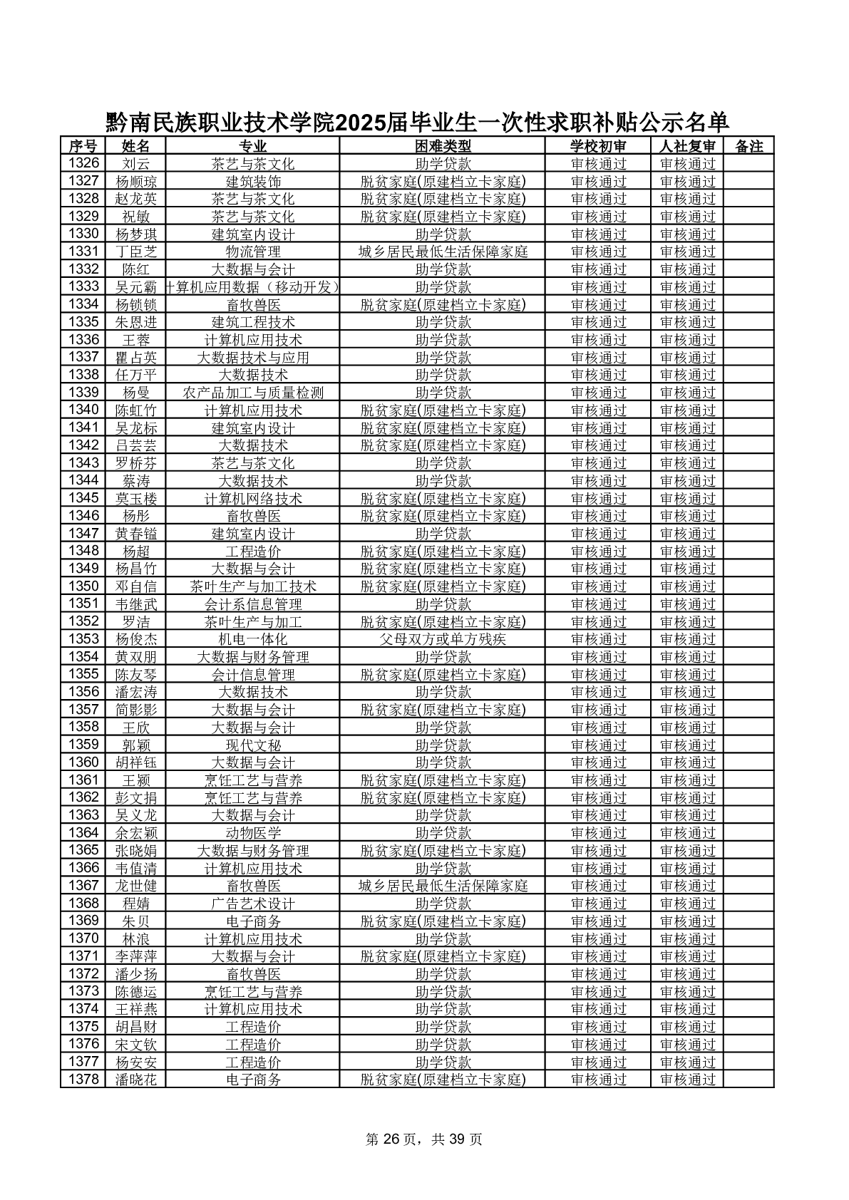 黔南民族职业技术学院2025届毕业生 一次性求职补贴申请审核通过公示
