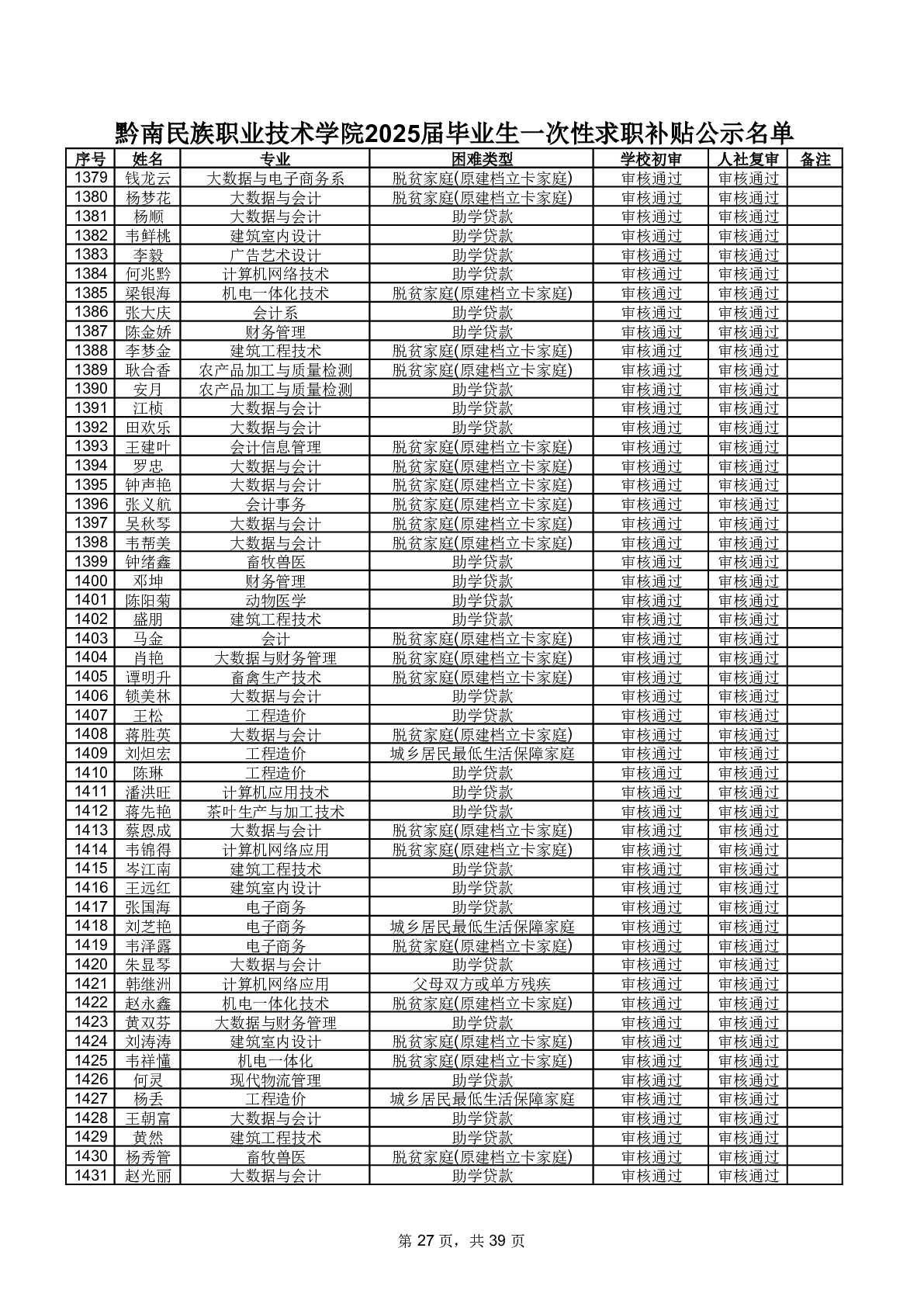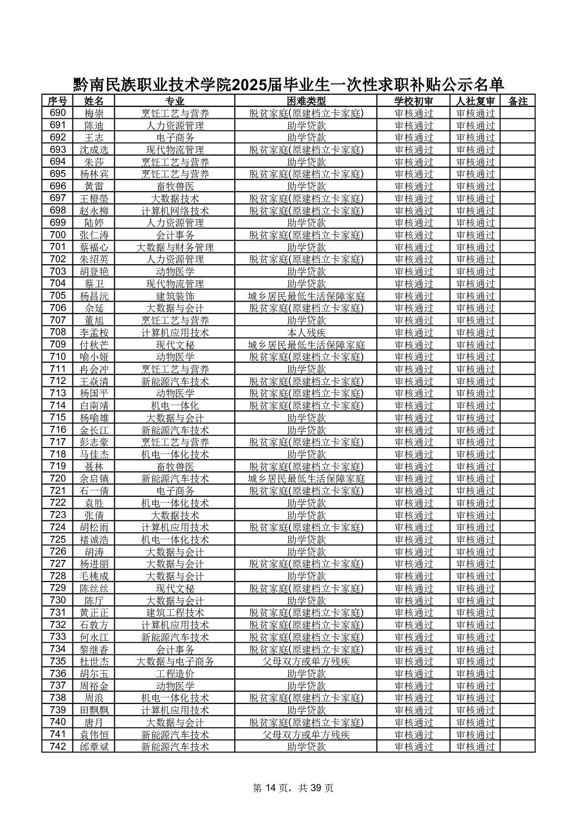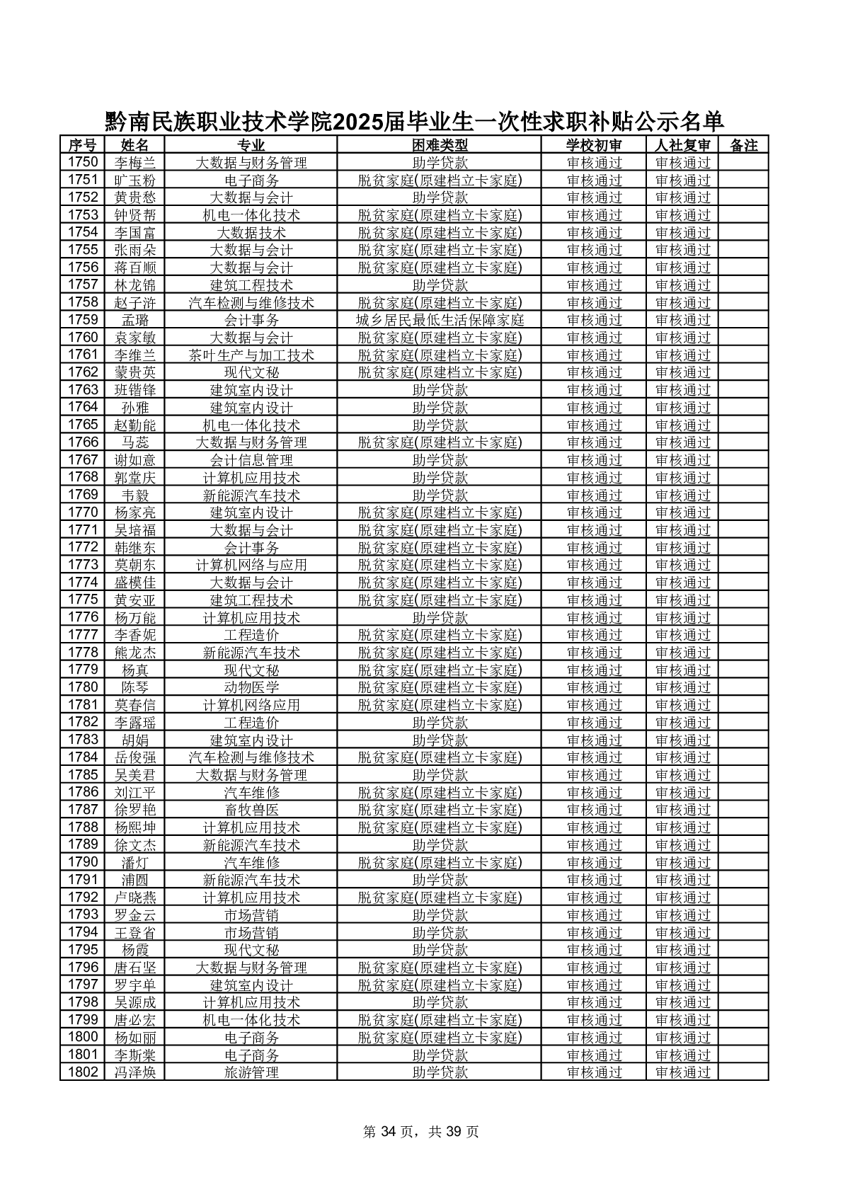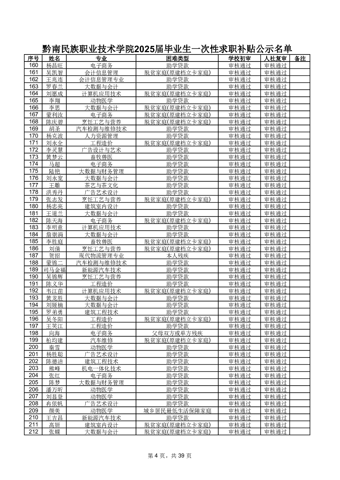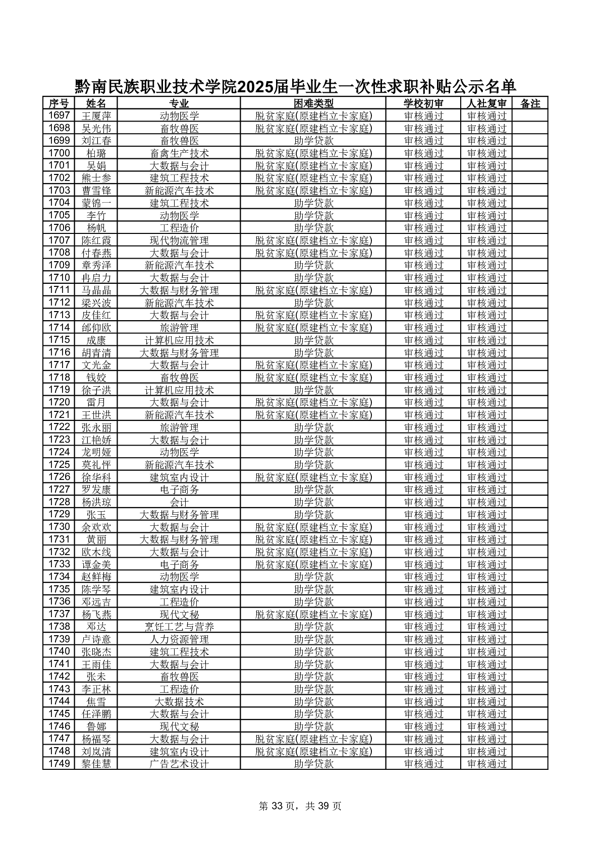 黔南民族职业技术学院2025届毕业生 一次性求职补贴申请审核通过公示