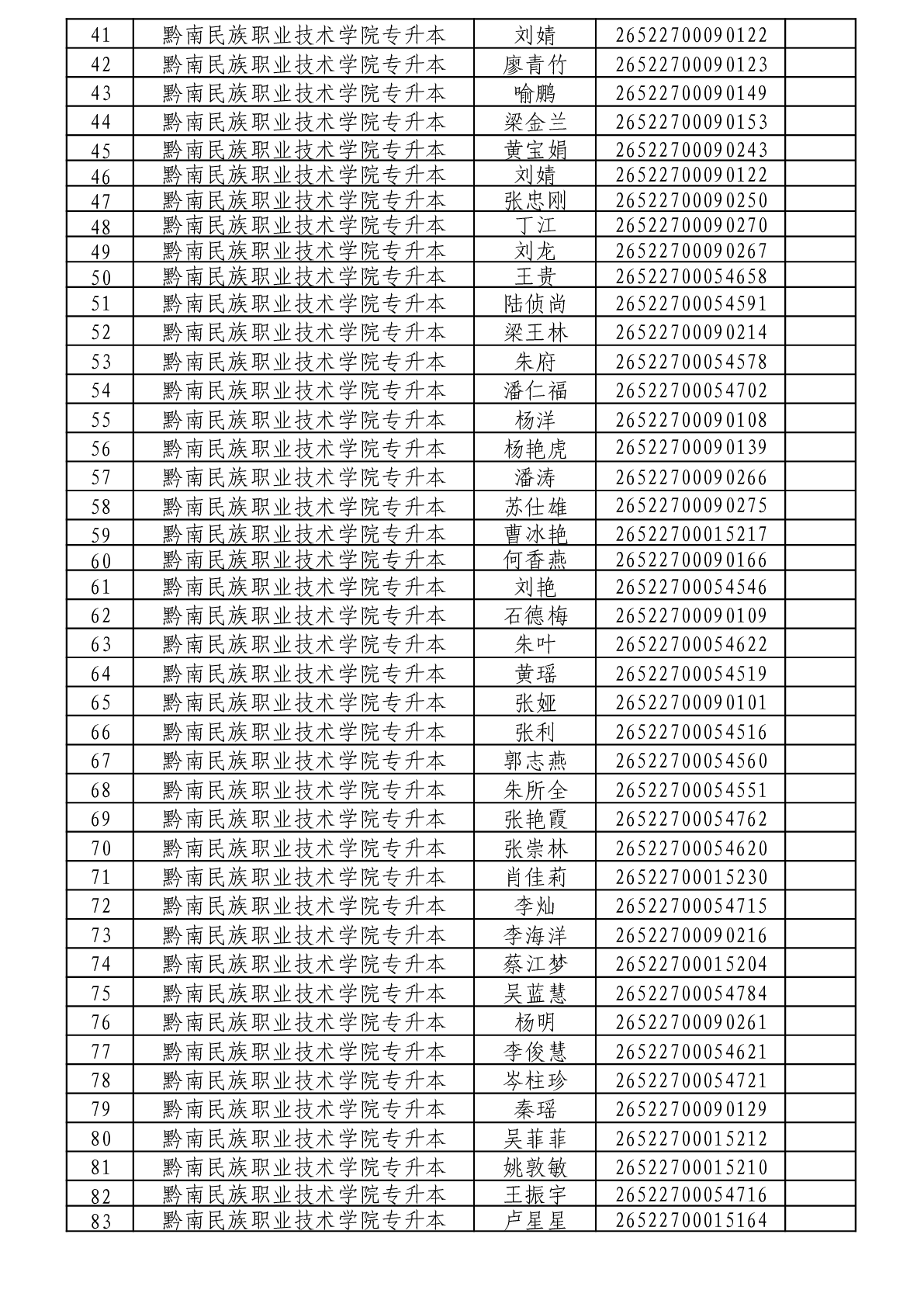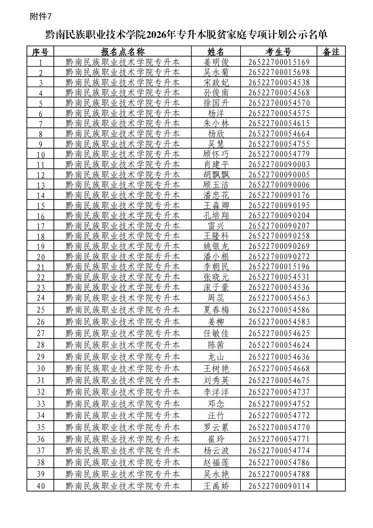 黔南民族职业技术学院2026年专升本脱贫家庭专项计划公示名单