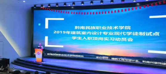 根据现代学徒制试点的工作部署,2019年7月4日上午,建筑工程与设计系在我院知行楼一楼报告厅举行了2019年建筑室内设计专业现代学徒制试点学生入职顶岗实习动员会。参加本次会议的有黔南州装饰建材行业商会潘建飞会长,学院党委委员、现代学徒制项目负责人张泽宽处长,建筑系何琳主任以及7家试点企业代表和即将奔赴企业入职的参与试点工作的建筑室内设计专业学生。