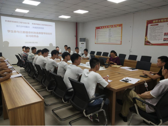 8月20日,建筑工程与设计系在建筑大楼会议室为2017级建筑工程技术专业即将赴三都县参加农村改造房屋考核验收顶岗实习的20名学生举行动员会。系党总支书记杨明凯、系主任何琳、建筑工程技术专业负责人许贵满、黔南州建设工程质量检测中心吴国兴主任出席会议。