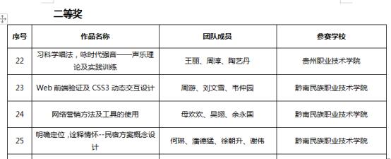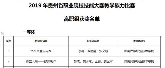 2019年贵州省职业院校技能大赛教学能力比赛现场决赛于2019年8月30日-31日在贵州交通职业技术学院举行。经过激烈的角逐我系彭成、姜卫军、裘子龙、王丽四位老师的作品《蜡染入纈-蜡染制作》获一等奖,并入围国赛;何琳、潘德猛、徐朝升、谢伟四位老师的作品《明确定位,诠释情怀—民宿方案概念设计》获二等奖。
