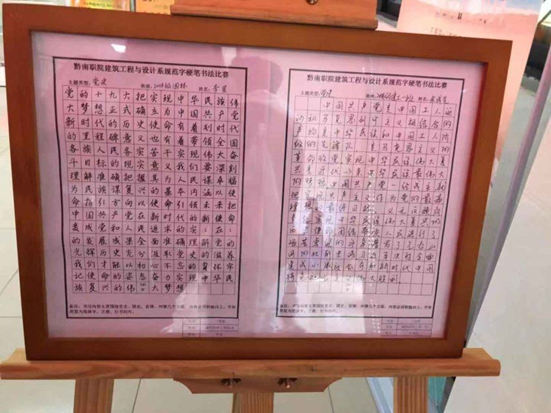 中华文化源远流长,书法是一种艺术,是中华民族的国粹。为庆祝祖国成立70周年华诞,传承并弘扬这一优秀的民族传统文化,营造良好的校园文化环境,丰富学生课后艺术文化生活,提高我系学生规范、端正、整洁地书写汉字的能力,养成良好的书写习惯,结合学院举办的“语言文字法律法规宣传教育工作方案”和“黔南州庆祝中华人民共和国成立70周年党史国史省情州情知识竞赛活动”方案的具体要求。目标给学生一个展示自我的舞台,让学生创造美、欣赏美,营造我系书法教育氛围,经系党总支研究,由我系团总支负责举办主要围绕“党史、国史、省情、州情”硬笔书法比赛。